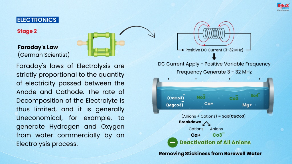 ELECTRONICS Stage 2 Faraday's Law (German Scientist) Faraday's laws of Electrolysis are strictly proportional to the quantity of electricity passed between the Anode and Cathode. The rate of Decomposition of the Electrolyte is thus limited, and it is generally Uneconomical, for example, to generate Hydrogen and Oxygen from water commercially by an Electrolysis process. DC Current Apply - Positive Variable Frequency Frequency Generate 3 - 32 MHz + + + + _ _ _ _ _ So4 No3 (CaCo3) (Mgco3) Co3 Ca+ Mg+ (Anions + Cations) = Salt(CaCo3) Breakdown Cations Anions _ Co3 Ca+ DeactivationofAllAnions Deactivation of All Anions Removing Stickiness from Borewell Water