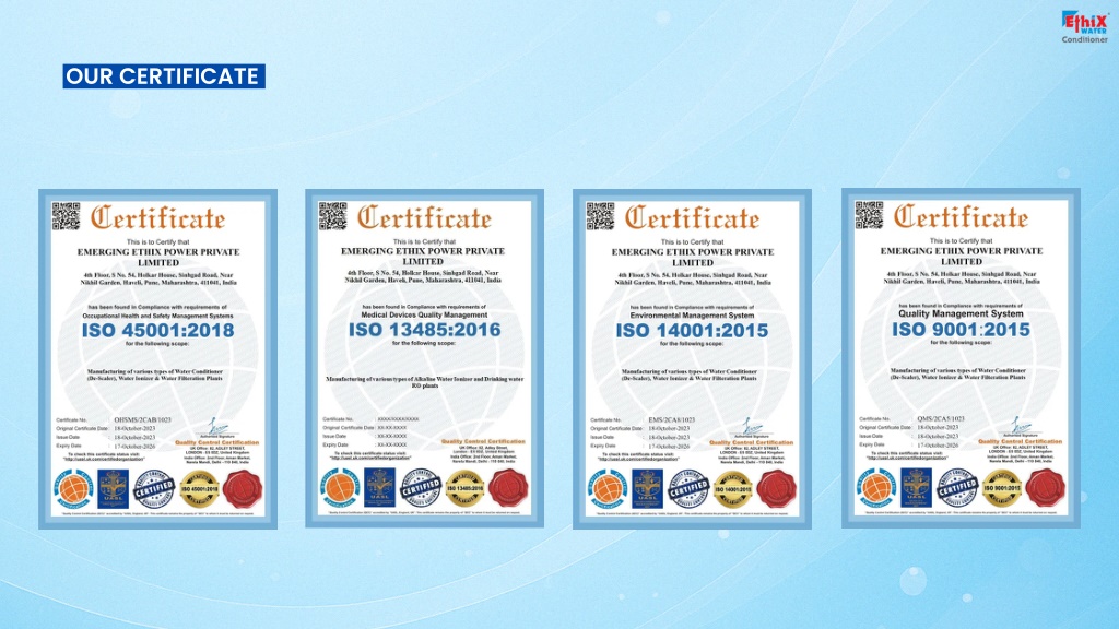 ABOUT US Emerging Ethix Power Pvt. Ltd., the brand behind the widely trusted Ethix Water Conditioner, is India’s No.1 emerging company offering sustainable, chemical-free solutions for hard water problems and limescale buildup. Established in 2010 in Pune, Maharashtra, we have over 15 years of expertise in manufacturing and exporting advanced water treatment systems. Our core product line includes the Scale Jammer, Alkaline Water Ionizers, and 3-Stage’s Water Conditioner, developed using German technology and backed by scientific research. We provide complete, maintenance-free water solutions that are safe for the environment and highly effective for individual homes, apartments, commercial spaces, industries, and the agriculture sector. Ethix serves a broad customer base across Pan India and exports to the Gulf, African, and Eastern countries through our growing dealer network. With a mission to simplify water treatment and protect both health and infrastructure, Ethix continues to lead the industry with innovative, hassle-free products and reliable service.