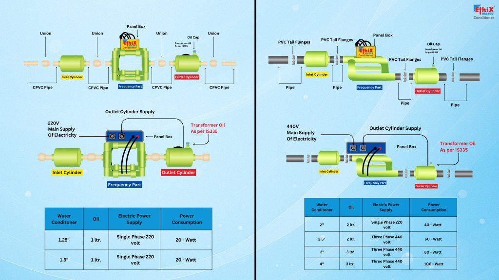 Panel Box Union Union Union Union Panel Box Oil Cap PVC Tail Flanges PVC Tail Flanges Oil Cap Transformer Oil As per IS335 Transformer Oil As per IS335 PVC Tail Flanges PVC Tail Flanges Inlet Cylinder Outlet Cylinder Inlet Cylinder Frequency Part Pipe Pipe CPVC Pipe CPVC Pipe CPVC Pipe CPVC Pipe Frequency Part Outlet Cylinder Pipe Pipe Outlet Cylinder Supply 220V Main Supply Of Electricity Transformer Oil As per IS335 440V Main Supply Of Electricity Outlet Cylinder Supply Panel Box Transformer Oil As per IS335 Panel Box Inlet Cylinder Outlet Cylinder Inlet Cylinder Frequency Part Frequency Part Outlet Cylinder Water Conditoner Electric Power Supply Power Oil Consumption Water Conditoner Electric Power Supply Power Oil Consumption Single Phase 220 volt 2" 2 ltr. 40 - Watt Single Phase 220 volt Three Phase 440 volt 2.5" 2 ltr. 60 - Watt 1.25" 1 ltr. 20 - Watt Three Phase 440 volt Three Phase 440 volt 3" 3 ltr. 80 - Watt Single Phase 220 volt 1.5" 1 ltr. 20 - Watt 4" 3 ltr. 100 - Watt