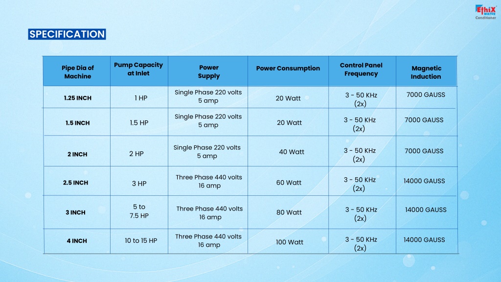 SPECIFICATION Pump Capacity at Inlet Control Panel Frequency Power Supply Pipe Dia of Machine Power Consumption Magnetic Induction Single Phase 220 volts 5 amp 7000 GAUSS 3 - 50 KHz (2x) 1 HP 20 Watt 1.25 INCH Single Phase 220 volts 5 amp 3 - 50 KHz (2x) 7000 GAUSS 1.5 HP 20 Watt 1.5 INCH Single Phase 220 volts 5 amp 3 - 50 KHz (2x) 7000 GAUSS 40 Watt 2 HP 2 INCH Three Phase 440 volts 16 amp 3 - 50 KHz (2x) 14000 GAUSS 60 Watt 2.5 INCH 3 HP 5 to 7.5 HP Three Phase 440 volts 16 amp 3 - 50 KHz (2x) 14000 GAUSS 80 Watt 3 INCH Three Phase 440 volts 16 amp 3 - 50 KHz (2x) 14000 GAUSS 10 to 15 HP 4 INCH 100 Watt