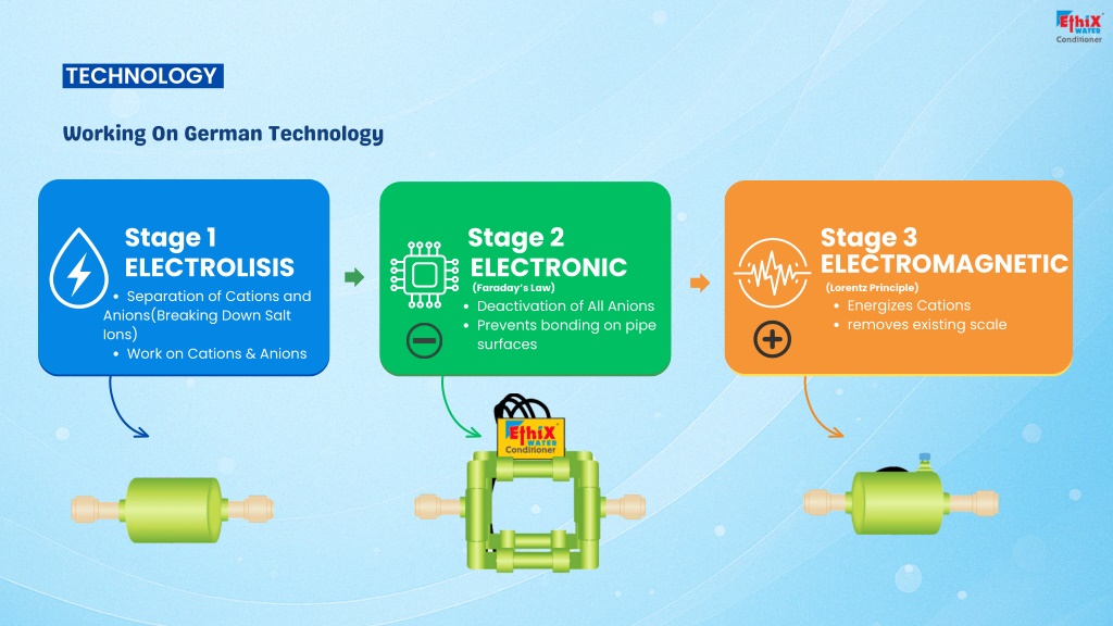 TECHNOLOGY Working On German Technology Stage 1 ELECTROLISIS Separation of Cations and Anions(Breaking Down Salt Ions) Work on Cations & Anions Stage 2 ELECTRONIC (Faraday’s Law) Stage 3 ELECTROMAGNETIC (Lorentz Principle) Energizes Cations removes existing scale Deactivation of All Anions Prevents bonding on pipe surfaces