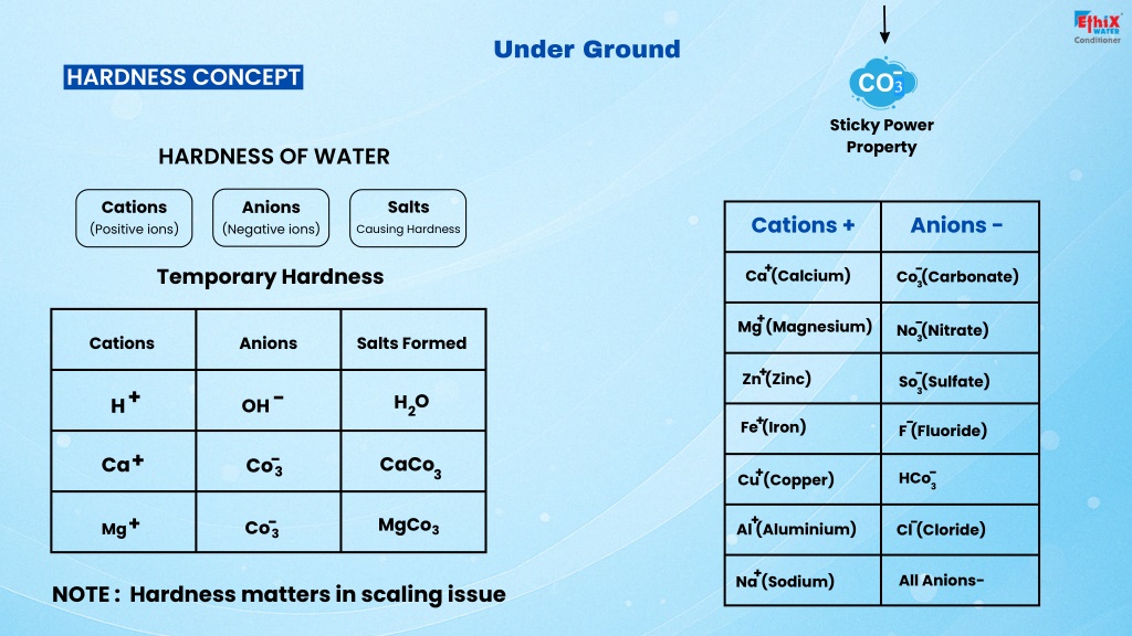 Under Ground - HARDNESS CONCEPT Sticky Power Property HARDNESS OF WATER Salts Cations (Positive ions) Anions (Negative ions) Cations + Anions - Causing Hardness + - Temporary Hardness Ca (Calcium) Co (Carbonate) 3 + - Mg (Magnesium) No (Nitrate) 3 Cations Anions Salts Formed + - Zn (Zinc) So (Sulfate) 3 H+ OH- H2O + - Fe (Iron) F (Fluoride) + - CaCo Ca Co 3 + HCo- 3 Cu (Copper) 3 + + - - MgCo Co3 Mg Al (Aluminium) Cl (Cloride) 3 + All Anions- Na (Sodium) NOTE : Hardness matters in scaling issue