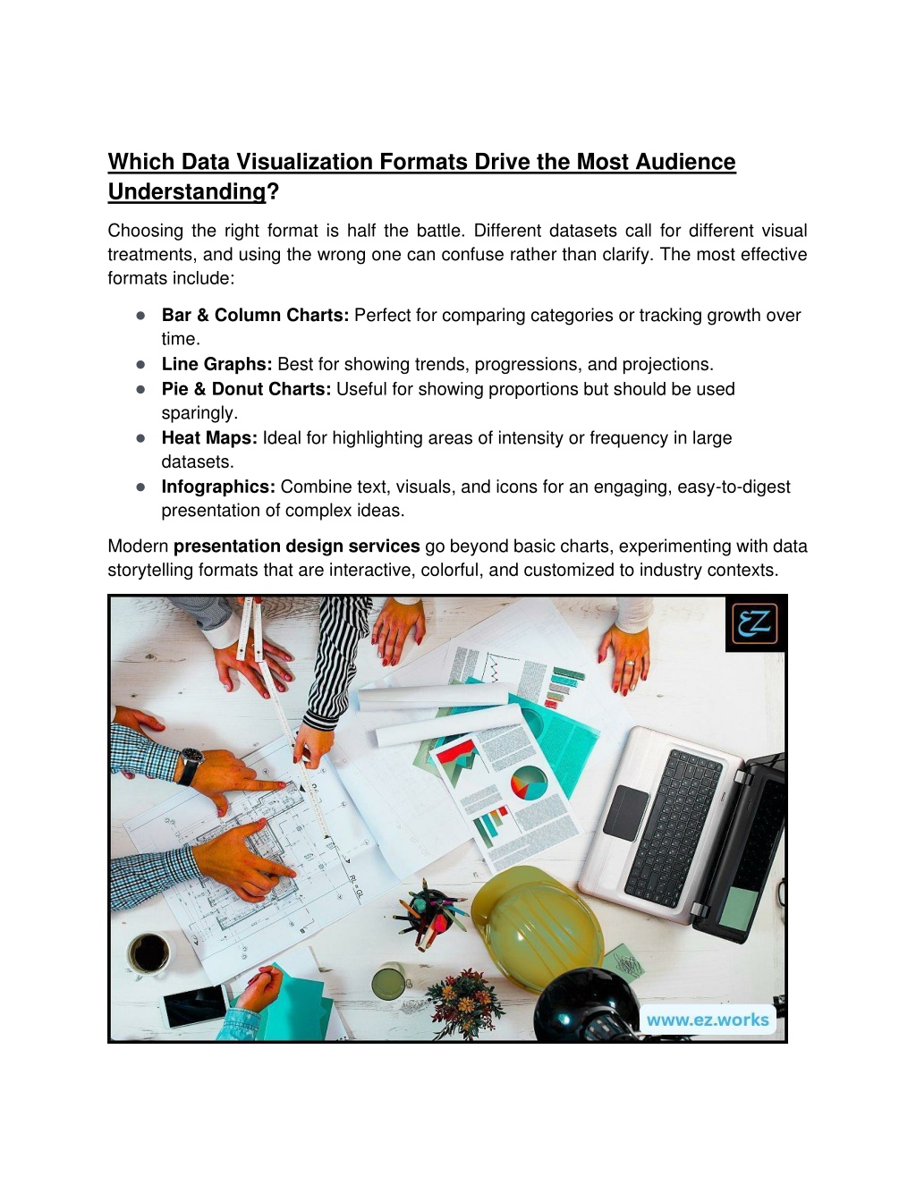 Which Data Visualization Formats Drive the Most Audience Understanding? Choosing the right format is half the battle. Different datasets call for different visual treatments, and using the wrong one can confuse rather than clarify. The most effective formats include: ●Bar & Column Charts: Perfect for comparing categories or tracking growth over time. ●Line Graphs: Best for showing trends, progressions, and projections. ●Pie & Donut Charts: Useful for showing proportions but should be used sparingly. ●Heat Maps: Ideal for highlighting areas of intensity or frequency in large datasets. ●Infographics: Combine text, visuals, and icons for an engaging, easy-to-digest presentation of complex ideas. Modern presentation design services go beyond basic charts, experimenting with data storytelling formats that are interactive, colorful, and customized to industry contexts.