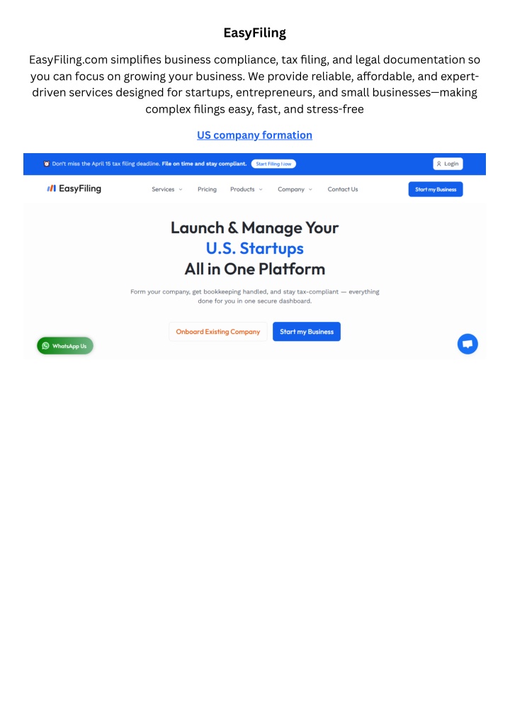 EasyFiling EasyFiling.com simplifies business compliance, tax filing, and legal documentation so you can focus on growing your business. We provide reliable, affordable, and expert- driven services designed for startups, entrepreneurs, and small businesses—making complex filings easy, fast, and stress-free US company formation