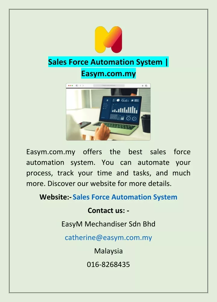 Sales Force Automation System | Easym.com.my Easym.com.my offers the best sales force automation system. You can automate your process, track your time and tasks, and much more. Discover our website for more details. Website:-Sales Force Automation System Contact us: - EasyM Mechandiser Sdn Bhd catherine@easym.com.my Malaysia 016-8268435