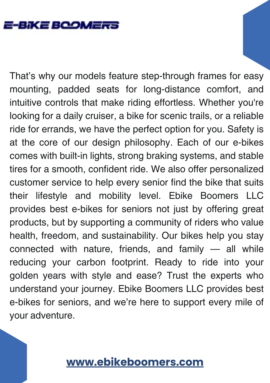 Geet Comfortable E-Bikes for Seniors to Ride with Ease Ebike Boomers LLC provides best e-bikes for seniors who are looking to rediscover the joy of cycling with comfort, safety, and ease. Our mission is simple — to help older adults stay active, independent, and adventurous with high- quality electric bikes designed specifically for their needs. At Ebike Boomers, we understand that seniors require more than just a standard e-bike. www.ebikeboomers.com