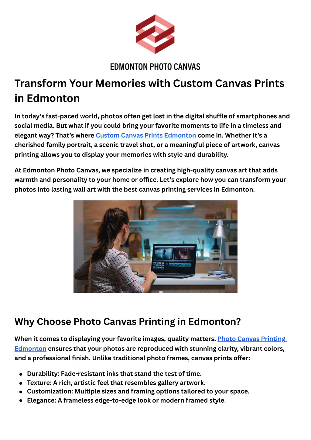 1. Transform Your Memories with Custom Canvas Prints in Edmonton In today’s fast-paced world, photos often get lost in the digital shuffle of smartphones and social media. But what if you could bring your favorite moments to life in a timeless and elegant way? That’s where Custom Canvas Prints Edmonton come in. Whether it’s a cherished family portrait, a scenic travel shot, or a meaningful piece of artwork, canvas printing allows you to display your memories with style and durability. At Edmonton Photo Canvas, we specialize in creating high-quality canvas art that adds warmth and personality to your home or o?ce. Let’s explore how you can transform your photos into lasting wall art with the best canvas printing services in Edmonton. Why Choose Photo Canvas Printing in Edmonton? When it comes to displaying your favorite images, quality matters. Photo Canvas Printing Edmonton ensures that your photos are reproduced with stunning clarity, vibrant colors, and a professional finish. Unlike traditional photo frames, canvas prints offer: Durability: Fade-resistant inks that stand the test of time. Texture: A rich, artistic feel that resembles gallery artwork. Customization: Multiple sizes and framing options tailored to your space. Elegance: A frameless edge-to-edge look or modern framed style.
