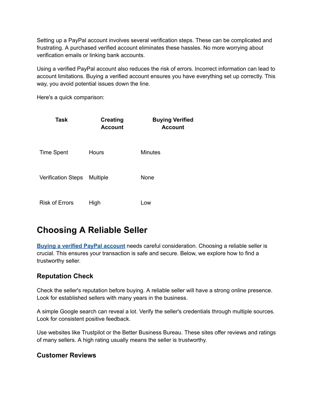 Setting up a PayPal account involves several verification steps. These can be complicated and frustrating. A purchased verified account eliminates these hassles. No more worrying about verification emails or linking bank accounts. Using a verified PayPal account also reduces the risk of errors. Incorrect information can lead to account limitations. Buying a verified account ensures you have everything set up correctly. This way, you avoid potential issues down the line. Here's a quick comparison: Task Creating Account Buying Verified Account Time Spent Hours Minutes Verification Steps Multiple None Risk of Errors High Low Choosing A Reliable Seller Buying a verified PayPal account needs careful consideration. Choosing a reliable seller is crucial. This ensures your transaction is safe and secure. Below, we explore how to find a trustworthy seller. Reputation Check Check the seller's reputation before buying. A reliable seller will have a strong online presence. Look for established sellers with many years in the business. A simple Google search can reveal a lot. Verify the seller's credentials through multiple sources. Look for consistent positive feedback. Use websites like Trustpilot or the Better Business Bureau. These sites offer reviews and ratings of many sellers. A high rating usually means the seller is trustworthy. Customer Reviews