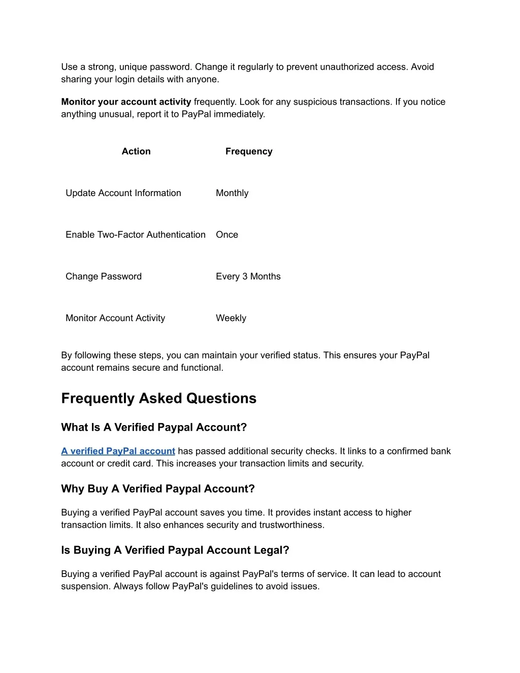 Use a strong, unique password. Change it regularly to prevent unauthorized access. Avoid sharing your login details with anyone. Monitor your account activity frequently. Look for any suspicious transactions. If you notice anything unusual, report it to PayPal immediately. Action Frequency Update Account Information Monthly Enable Two-Factor Authentication Once Change Password Every 3 Months Monitor Account Activity Weekly By following these steps, you can maintain your verified status. This ensures your PayPal account remains secure and functional. Frequently Asked Questions What Is A Verified Paypal Account? A verified PayPal account has passed additional security checks. It links to a confirmed bank account or credit card. This increases your transaction limits and security. Why Buy A Verified Paypal Account? Buying a verified PayPal account saves you time. It provides instant access to higher transaction limits. It also enhances security and trustworthiness. Is Buying A Verified Paypal Account Legal? Buying a verified PayPal account is against PayPal's terms of service. It can lead to account suspension. Always follow PayPal's guidelines to avoid issues.