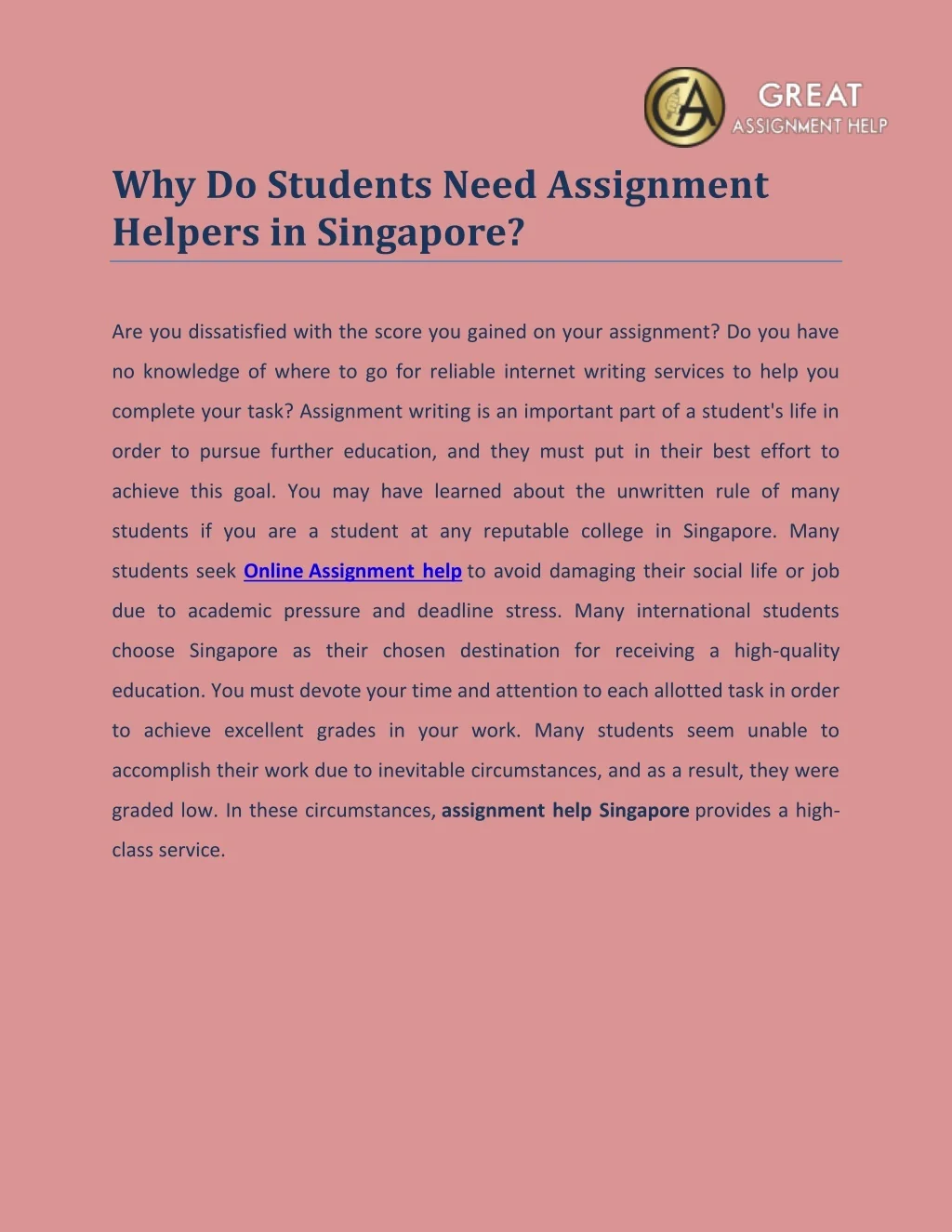 Why Do Students Need Assignment Helpers in Singapore? Are you dissatisfied with the score you gained on your assignment? Do you have no knowledge of where to go for reliable internet writing services to help you complete your task? Assignment writing is an important part of a student's life in order to pursue further education, and they must put in their best effort to achieve this goal. You may have learned about the unwritten rule of many students if you are a student at any reputable college in Singapore. Many students seek OnlineAssignment help to avoid damaging their social life or job due to academic pressure and deadline stress. Many international students choose Singapore as their chosen destination for receiving a high-quality education. You must devote your time and attention to each allotted task in order to achieve excellent grades in your work. Many students seem unable to accomplish their work due to inevitable circumstances, and as a result, they were graded low. In these circumstances, assignment help Singapore provides a high- class service.