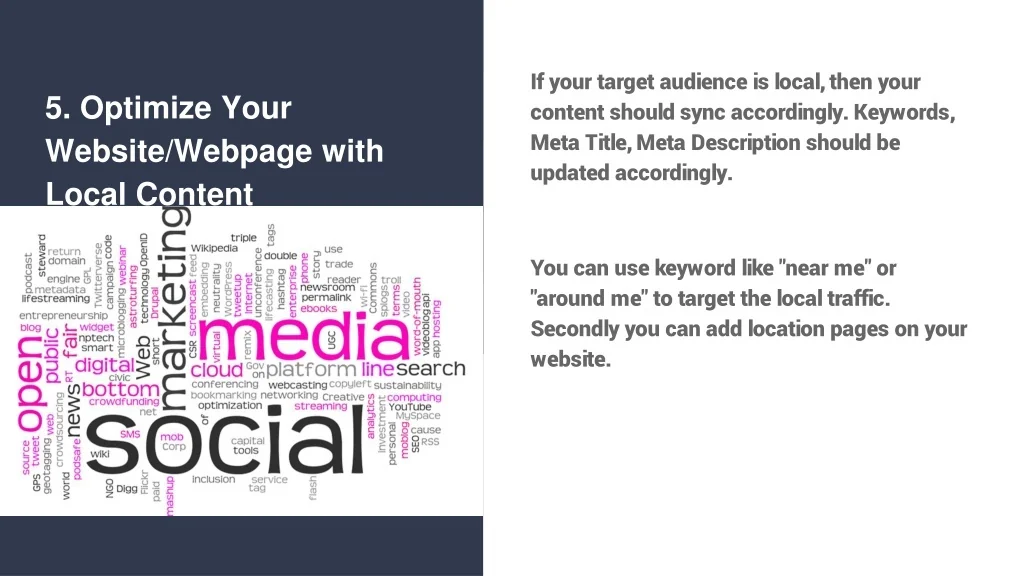5. Optimize Your Website/Webpage with Local Content If your target audience is local, then your content should sync accordingly. Keywords, Meta Title, Meta Description should be updated accordingly. You can use keyword like "near me" or "around me" to target the local traffic. Secondly you can add location pages on your website.