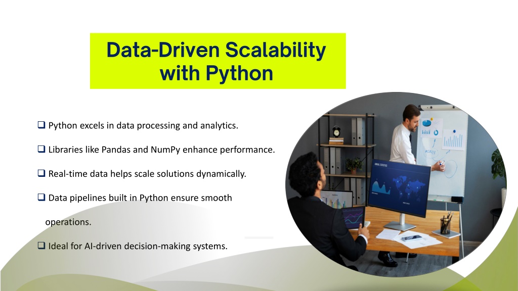 Data -Driven Scalability with Python ❑ Python excels in data processing and analytics. ❑ Libraries like Pandas and NumPy enhance performance. ❑ Real-time data helps scale solutions dynamically. ❑ Data pipelines built in Python ensure smooth operations. ❑ Ideal for AI-driven decision-making systems.