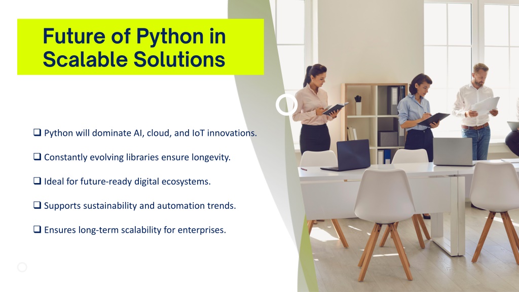 Future of Python in Scalable Solutions ❑ Python will dominate AI, cloud, and IoT innovations. ❑ Constantly evolving libraries ensure longevity. ❑ Ideal for future-ready digital ecosystems. ❑ Supports sustainability and automation trends. ❑ Ensures long-term scalability for enterprises.