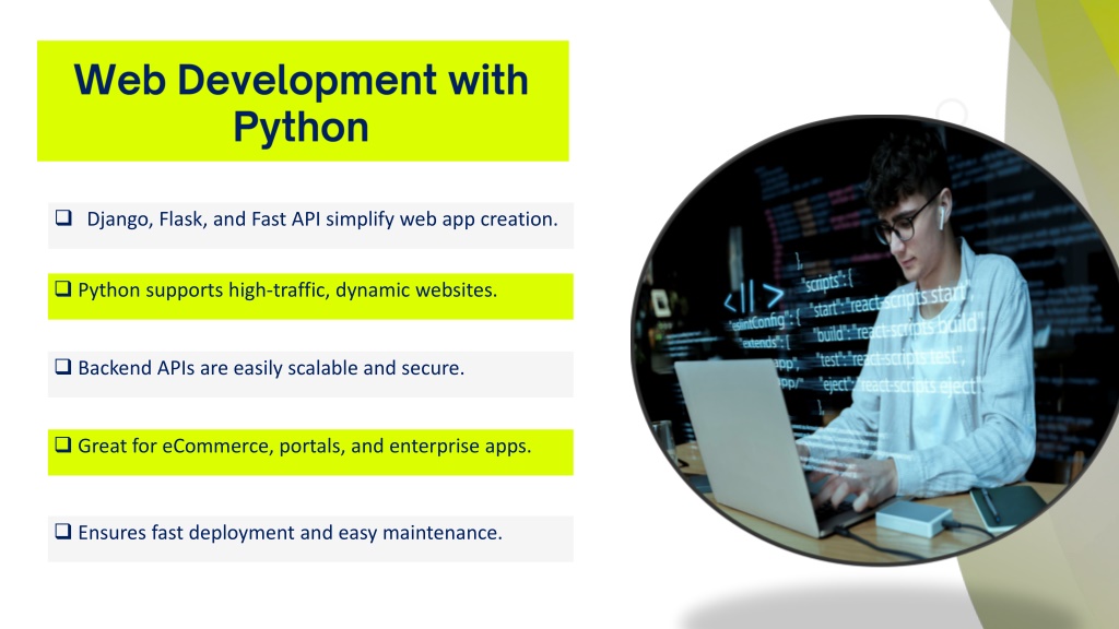 Web Development with Python ❑ Django, Flask, and Fast API simplify web app creation. ❑ Python supports high-traffic, dynamic websites. ❑ Backend APIs are easily scalable and secure. ❑ Great for eCommerce, portals, and enterprise apps. ❑ Ensures fast deployment and easy maintenance.
