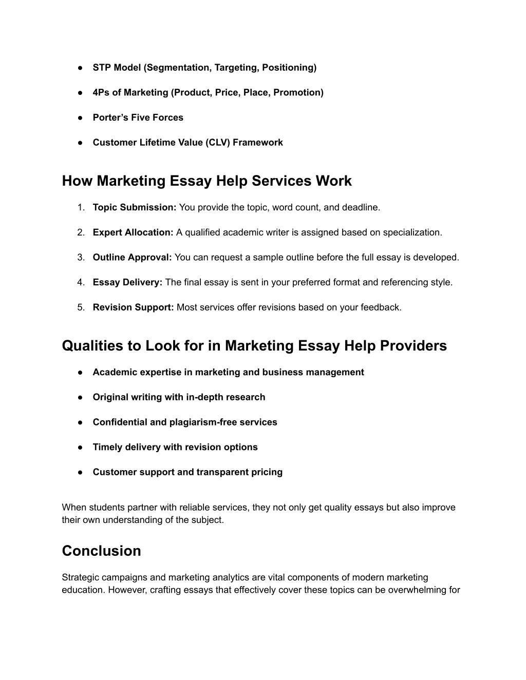 ● STP Model (Segmentation, Targeting, Positioning) ● 4Ps of Marketing (Product, Price, Place, Promotion) ● Porter’s Five Forces ● Customer Lifetime Value (CLV) Framework How Marketing Essay Help Services Work 1. Topic Submission: You provide the topic, word count, and deadline. 2. Expert Allocation: A qualified academic writer is assigned based on specialization. 3. Outline Approval: You can request a sample outline before the full essay is developed. 4. Essay Delivery: The final essay is sent in your preferred format and referencing style. 5. Revision Support: Most services offer revisions based on your feedback. Qualities to Look for in Marketing Essay Help Providers ● Academic expertise in marketing and business management ● Original writing with in-depth research ● Confidential and plagiarism-free services ● Timely delivery with revision options ● Customer support and transparent pricing When students partner with reliable services, they not only get quality essays but also improve their own understanding of the subject. Conclusion Strategic campaigns and marketing analytics are vital components of modern marketing education. However, crafting essays that effectively cover these topics can be overwhelming for