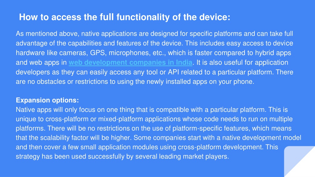 As mentioned above, native applications are designed for specific platforms and can take full advantage of the capabilities and features of the device. This includes easy access to device hardware like cameras, GPS, microphones, etc., which is faster compared to hybrid apps and web apps in web development companies in India. It is also useful for application developers as they can easily access any tool or API related to a particular platform. There are no obstacles or restrictions to using the newly installed apps on your phone. Expansion options: Native apps will only focus on one thing that is compatible with a particular platform. This is unique to cross-platform or mixed-platform applications whose code needs to run on multiple platforms. There will be no restrictions on the use of platform-specific features, which means that the scalability factor will be higher. Some companies start with a native development model and then cover a few small application modules using cross-platform development. This strategy has been used successfully by several leading market players. How to access the full functionality of the device: