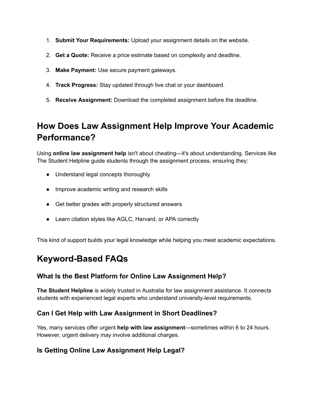 1. Submit Your Requirements: Upload your assignment details on the website. 2. Get a Quote: Receive a price estimate based on complexity and deadline. 3. Make Payment: Use secure payment gateways. 4. Track Progress: Stay updated through live chat or your dashboard. 5. Receive Assignment: Download the completed assignment before the deadline. How Does Law Assignment Help Improve Your Academic Performance? Using online law assignment help isn't about cheating—it's about understanding. Services like The Student Helpline guide students through the assignment process, ensuring they: ● Understand legal concepts thoroughly ● Improve academic writing and research skills ● Get better grades with properly structured answers ● Learn citation styles like AGLC, Harvard, or APA correctly This kind of support builds your legal knowledge while helping you meet academic expectations. Keyword-Based FAQs What Is the Best Platform for Online Law Assignment Help? The Student Helpline is widely trusted in Australia for law assignment assistance. It connects students with experienced legal experts who understand university-level requirements. Can I Get Help with Law Assignment in Short Deadlines? Yes, many services offer urgent help with law assignment—sometimes within 6 to 24 hours. However, urgent delivery may involve additional charges. Is Getting Online Law Assignment Help Legal?