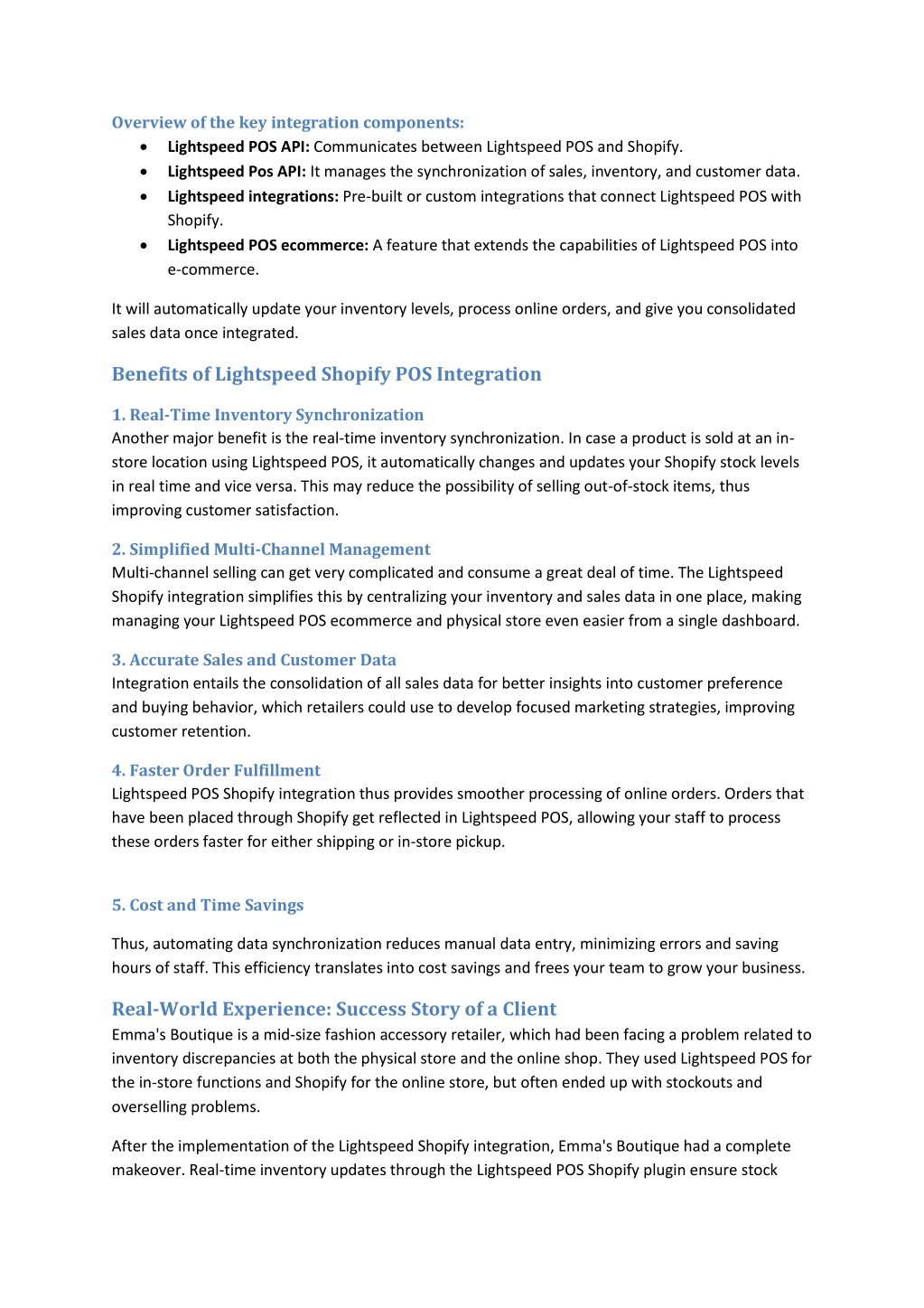 Overview of the key integration components: Lightspeed POS API: Communicates between Lightspeed POS and Shopify. Lightspeed Pos API: It manages the synchronization of sales, inventory, and customer data. Lightspeed integrations: Pre-built or custom integrations that connect Lightspeed POS with Shopify. Lightspeed POS ecommerce: A feature that extends the capabilities of Lightspeed POS into e-commerce. It will automatically update your inventory levels, process online orders, and give you consolidated sales data once integrated. Benefits of Lightspeed Shopify POS Integration 1. Real-Time Inventory Synchronization Another major benefit is the real-time inventory synchronization. In case a product is sold at an in- store location using Lightspeed POS, it automatically changes and updates your Shopify stock levels in real time and vice versa. This may reduce the possibility of selling out-of-stock items, thus improving customer satisfaction. 2. Simplified Multi-Channel Management Multi-channel selling can get very complicated and consume a great deal of time. The Lightspeed Shopify integration simplifies this by centralizing your inventory and sales data in one place, making managing your Lightspeed POS ecommerce and physical store even easier from a single dashboard. 3. Accurate Sales and Customer Data Integration entails the consolidation of all sales data for better insights into customer preference and buying behavior, which retailers could use to develop focused marketing strategies, improving customer retention. 4. Faster Order Fulfillment Lightspeed POS Shopify integration thus provides smoother processing of online orders. Orders that have been placed through Shopify get reflected in Lightspeed POS, allowing your staff to process these orders faster for either shipping or in-store pickup. 5. Cost and Time Savings Thus, automating data synchronization reduces manual data entry, minimizing errors and saving hours of staff. This efficiency translates into cost savings and frees your team to grow your business. Real-World Experience: Success Story of a Client Emma's Boutique is a mid-size fashion accessory retailer, which had been facing a problem related to inventory discrepancies at both the physical store and the online shop. They used Lightspeed POS for the in-store functions and Shopify for the online store, but often ended up with stockouts and overselling problems. After the implementation of the Lightspeed Shopify integration, Emma's Boutique had a complete makeover. Real-time inventory updates through the Lightspeed POS Shopify plugin ensure stock