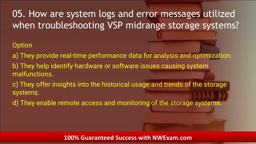 05. 05. How are system logs and error messages utilized when troubleshooting VSP midrange storage systems? Option a) They provide real-time performance data for analysis and optimization. Option b) They help identify hardware or software issues causing system malfunctions. c) They offer insights into the historical usage and trends of the storage systems. d) They enable remote access and monitoring of the storage systems. 100% Guaranteed Success with NWExam.com 100% Guaranteed Success with NWExam.com