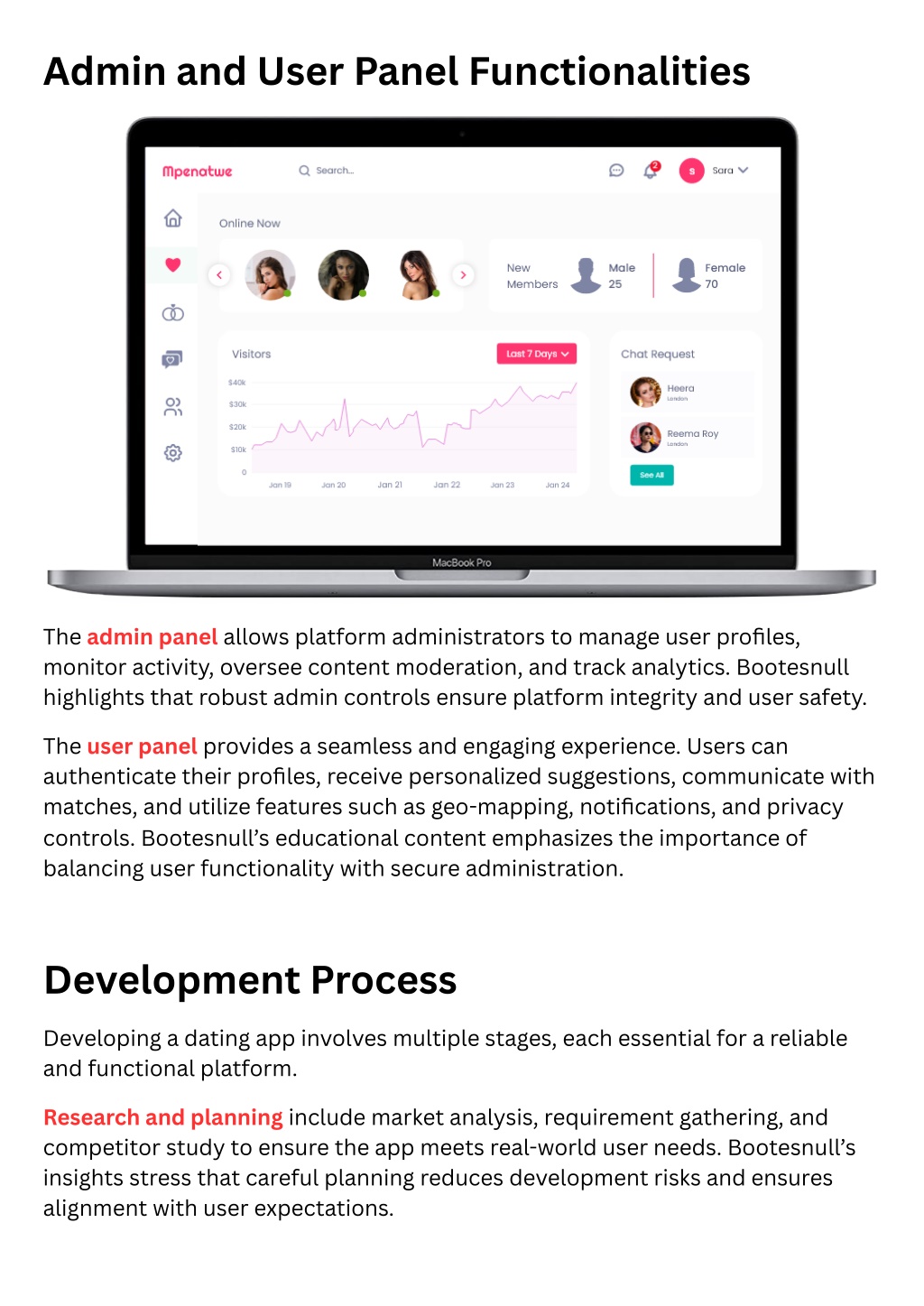 Admin and User Panel Functionalities The admin panel allows platform administrators to manage user profiles, monitor activity, oversee content moderation, and track analytics. Bootesnull highlights that robust admin controls ensure platform integrity and user safety. The user panel provides a seamless and engaging experience. Users can authenticate their profiles, receive personalized suggestions, communicate with matches, and utilize features such as geo-mapping, notifications, and privacy controls. Bootesnull’s educational content emphasizes the importance of balancing user functionality with secure administration. Development Process Developing a dating app involves multiple stages, each essential for a reliable and functional platform. Research and planning include market analysis, requirement gathering, and competitor study to ensure the app meets real-world user needs. Bootesnull’s insights stress that careful planning reduces development risks and ensures alignment with user expectations.