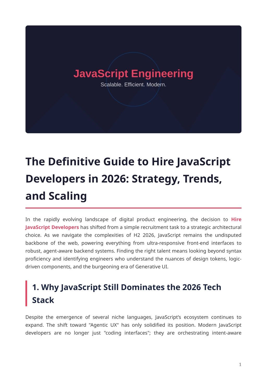 JavaScript Engineering Scalable. Efficient. Modern. The Definitive Guide to Hire JavaScript Developers in 2026: Strategy, Trends, and Scaling In the rapidly evolving landscape of digital product engineering, the decision to Hire JavaScript Developers has shifted from a simple recruitment task to a strategic architectural choice. As we navigate the complexities of H2 2026, JavaScript remains the undisputed backbone of the web, powering everything from ultra-responsive front-end interfaces to robust, agent-aware backend systems. Finding the right talent means looking beyond syntax proficiency and identifying engineers who understand the nuances of design tokens, logic- driven components, and the burgeoning era of Generative UI. 1. Why JavaScript Still Dominates the 2026 Tech Stack Despite the emergence of several niche languages, JavaScript’s ecosystem continues to expand. The shift toward "Agentic UX" has only solidified its position. Modern JavaScript developers are no longer just "coding interfaces"; they are orchestrating intent-aware 1