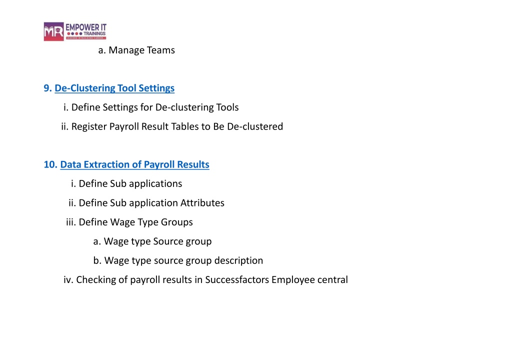 a.ManageTeams • De-ClusteringToolSettings • DefineSettings forDe-clusteringTools • RegisterPayroll Result Tables to BeDe-clustered • DataExtractionofPayrollResults • DefineSubapplications • DefineSubapplicationAttributes • DefineWageTypeGroups • WagetypeSourcegroup • Wagetypesourcegroup description • Checkingof payroll results in Successfactors Employee central