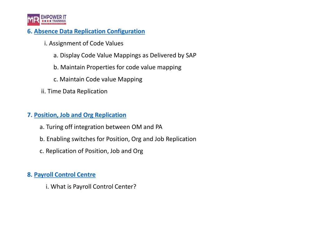 AbsenceDataReplicationConfiguration • AssignmentofCodeValues • DisplayCodeValueMappingsasDeliveredbySAP • MaintainPropertiesforcode valuemapping • MaintainCodevalueMapping • TimeDataReplication • Position,Joband OrgReplication • Turingoffintegrationbetween OMandPA • Enablingswitches forPosition,OrgandJobReplication • ReplicationofPosition,Joband Org • PayrollControl Centre • WhatisPayrollControlCenter?