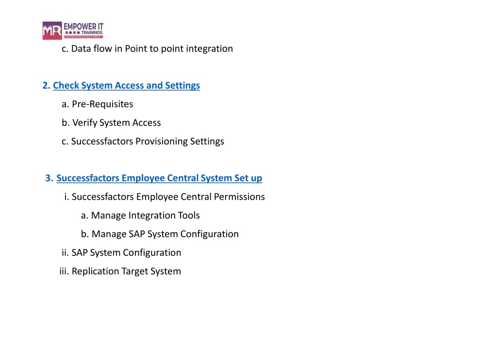 c.Dataflow inPoint to pointintegration • CheckSystemAccessandSettings • Pre-Requisites • VerifySystemAccess • SuccessfactorsProvisioningSettings • SuccessfactorsEmployeeCentralSystemSetup • SuccessfactorsEmployeeCentralPermissions • ManageIntegrationTools • ManageSAPSystemConfiguration • SAPSystemConfiguration • Replication TargetSystem