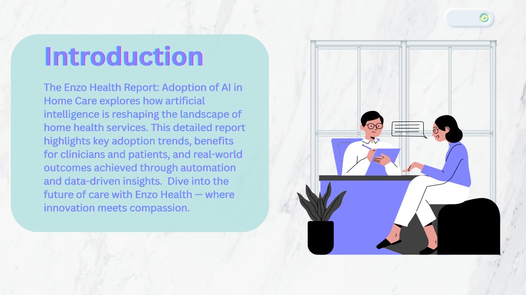 Introduction Introduction Introduction The Enzo Health Report: Adoption of AI in The Enzo Health Report: Adoption of AI in Home Care explores how artificial Home Care explores how artificial intelligence is reshaping the landscape of intelligence is reshaping the landscape of home health services. This detailed report home health services. This detailed report highlights key adoption trends, benefits highlights key adoption trends, benefits for clinicians and patients, and real-world for clinicians and patients, and real-world outcomes achieved through automation outcomes achieved through automation and data-driven insights. and data-driven insights.Dive into the future of care with Enzo Health — where future of care with Enzo Health — where innovation meets compassion. innovation meets compassion. innovation meets compassion. The Enzo Health Report: Adoption of AI in Home Care explores how artificial intelligence is reshaping the landscape of home health services. This detailed report highlights key adoption trends, benefits for clinicians and patients, and real-world outcomes achieved through automation and data-driven insights. Dive into the future of care with Enzo Health — where Dive into the