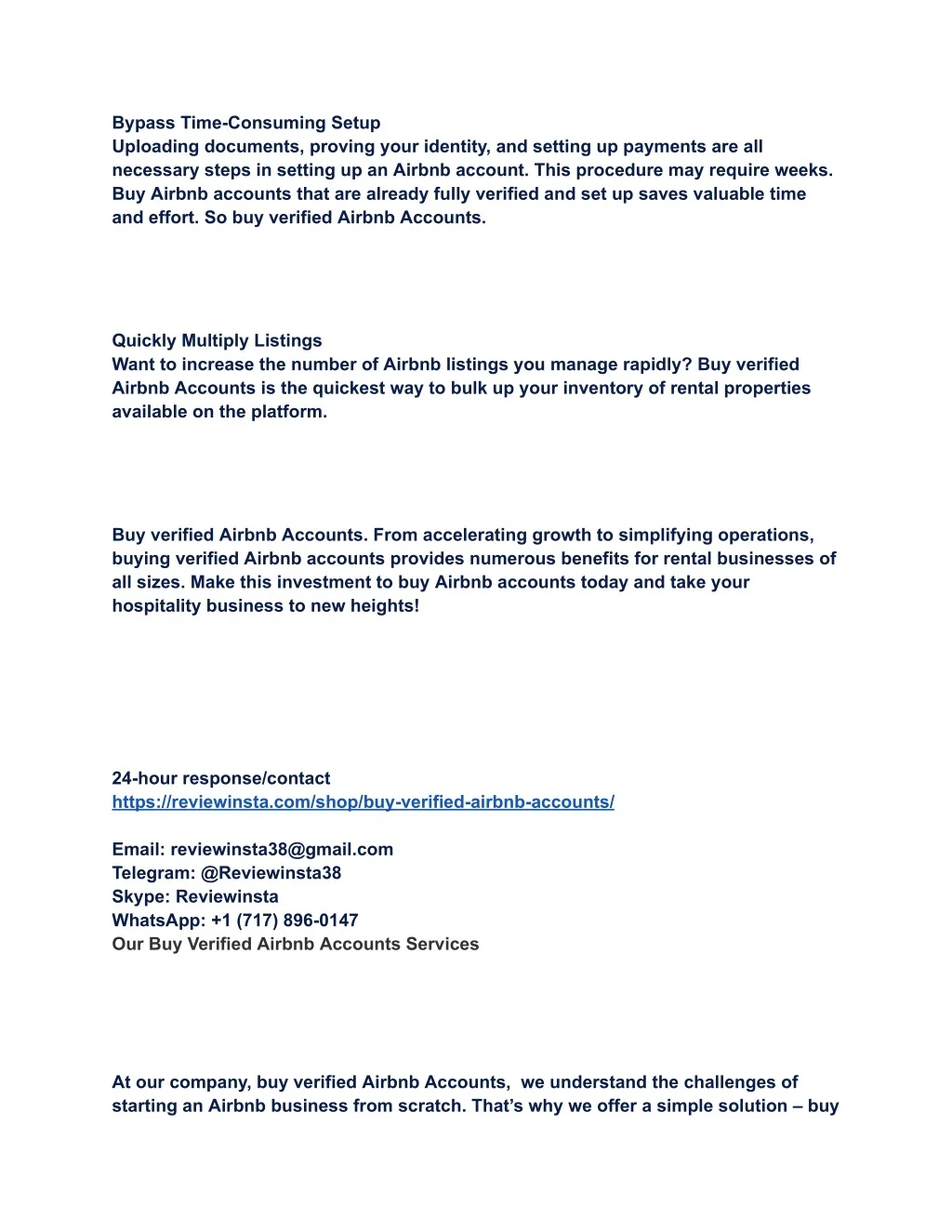 24-hour response/contact https://reviewinsta.com/shop/buy-verified-airbnb-accounts/ Email: reviewinsta38@gmail.com Telegram: @Reviewinsta38 Skype: Reviewinsta WhatsApp: +1 (717) 896-0147 Boost Your Credibility Guests on Airbnb prefer hosts with good reviews and ratings. A new account with no reviews can make it hard to get bookings initially. However, when you buy verified airbnb accounts that already has positive reviews, you instantly gain credibility. Access Premium Features Airbnb offers special features like instant booking and smart pricing to select hosts. Normally, you need an active hosting history to unlock these premium tools. But buy Airbnb account gives you access to advanced features from day one, helping you maximize your earnings. Expand Business Easily If you have multiple rental properties, managing each one on a separate Airbnb account becomes much easier. Buying multiple verified Airbnb accounts allows you to neatly organize listings while building credibility for each property. Higher Investment Returns 24-hour response/contact https://reviewinsta.com/shop/buy-verified-airbnb-accounts/ Email: reviewinsta38@gmail.com