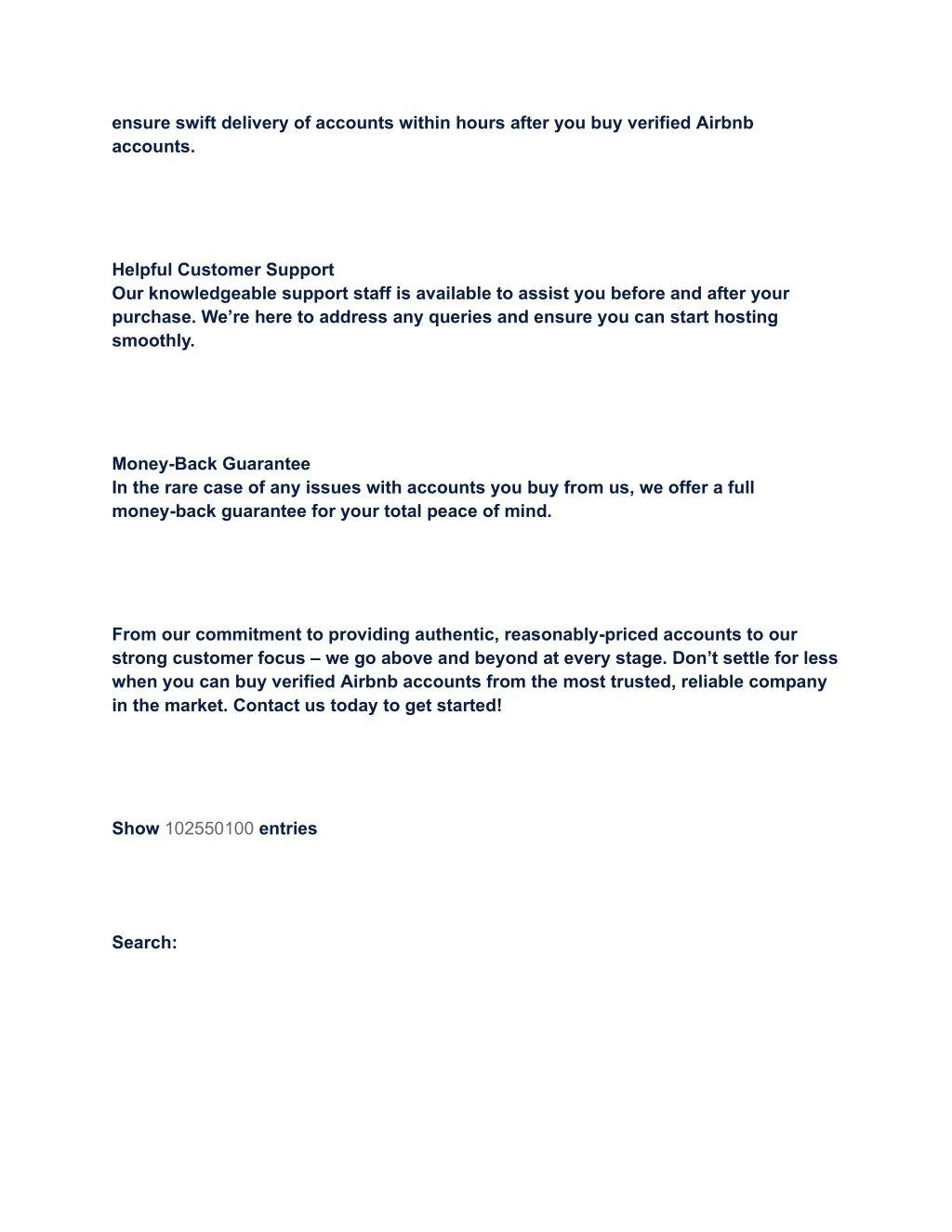 ensure swift delivery of accounts within hours after you buy verified Airbnb accounts. Helpful Customer Support Our knowledgeable support staff is available to assist you before and after your purchase. We’re here to address any queries and ensure you can start hosting smoothly. Money-Back Guarantee In the rare case of any issues with accounts you buy from us, we offer a full money-back guarantee for your total peace of mind. From our commitment to providing authentic, reasonably-priced accounts to our strong customer focus – we go above and beyond at every stage. Don’t settle for less when you can buy verified Airbnb accounts from the most trusted, reliable company in the market. Contact us today to get started! Show 102550100 entries Search: