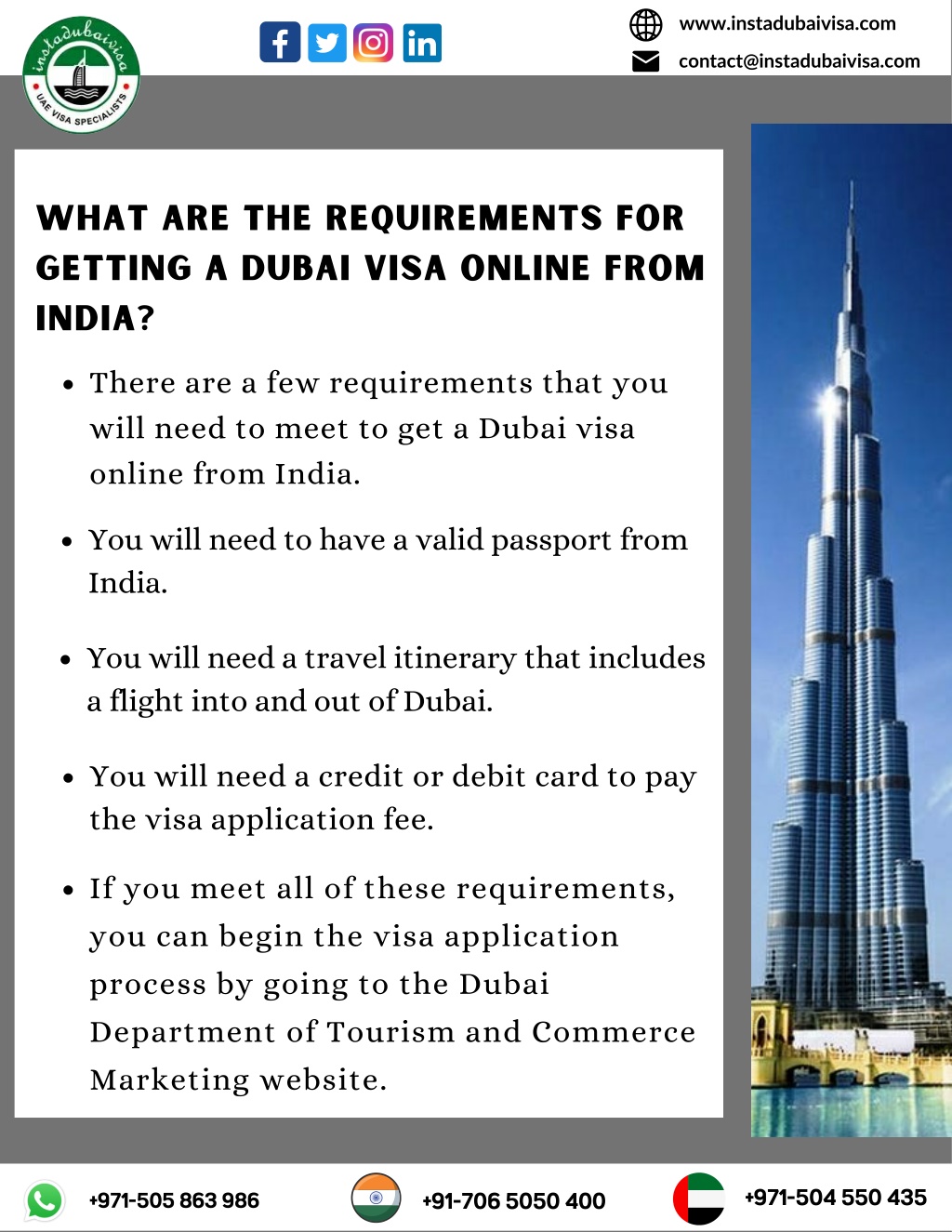 www.instadubaivisa.com contact@instadubaivisa.com What are the requirements for getting a Dubai visa online from India? There are a few requirements that you will need to meet to get a Dubai visa online from India. You will need to have a valid passport from India. You will need a travel itinerary that includes a flight into and out of Dubai. You will need a credit or debit card to pay the visa application fee. If you meet all of these requirements, you can begin the visa application process by going to the Dubai Department of Tourism and Commerce Marketing website. +971-504 550 435 +91-706 5050 400 +971-505 863 986