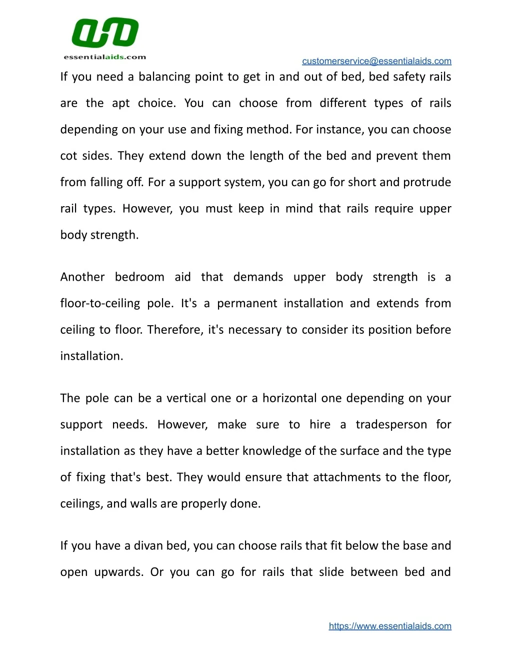 customerservice@essentialaids.com If you need a balancing point to get in and out of bed, bed safety rails are the apt choice. You can choose from different types of rails depending on your use and fixing method. For instance, you can choose cot sides. They extend down the length of the bed and prevent them from falling off. For a support system, you can go for short and protrude rail types. However, you must keep in mind that rails require upper body strength. Another bedroom aid that demands upper body strength is a floor-to-ceiling pole. It's a permanent installation and extends from ceiling to floor. Therefore, it's necessary to consider its position before installation. The pole can be a vertical one or a horizontal one depending on your support needs. However, make sure to hire a tradesperson for installation as they have a better knowledge of the surface and the type of fixing that's best. They would ensure that attachments to the floor, ceilings, and walls are properly done. If you have a divan bed, you can choose rails that fit below the base and open upwards. Or you can go for rails that slide between bed and https://www.essentialaids.com