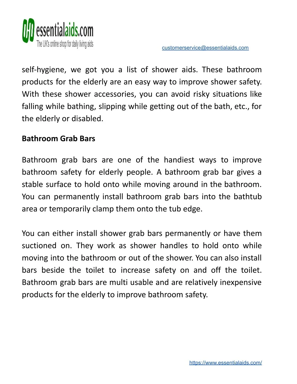 customerservice@essentialaids.com self-hygiene, we got you a list of shower aids. These bathroom products for the elderly are an easy way to improve shower safety. With these shower accessories, you can avoid risky situations like falling while bathing, slipping while getting out of the bath, etc., for the elderly or disabled. Bathroom Grab Bars Bathroom grab bars are one of the handiest ways to improve bathroom safety for elderly people. A bathroom grab bar gives a stable surface to hold onto while moving around in the bathroom. You can permanently install bathroom grab bars into the bathtub area or temporarily clamp them onto the tub edge. You can either install shower grab bars permanently or have them suctioned on. They work as shower handles to hold onto while moving into the bathroom or out of the shower. You can also install bars beside the toilet to increase safety on and off the toilet. Bathroom grab bars are multi usable and are relatively inexpensive products for the elderly to improve bathroom safety. https://www.essentialaids.com/