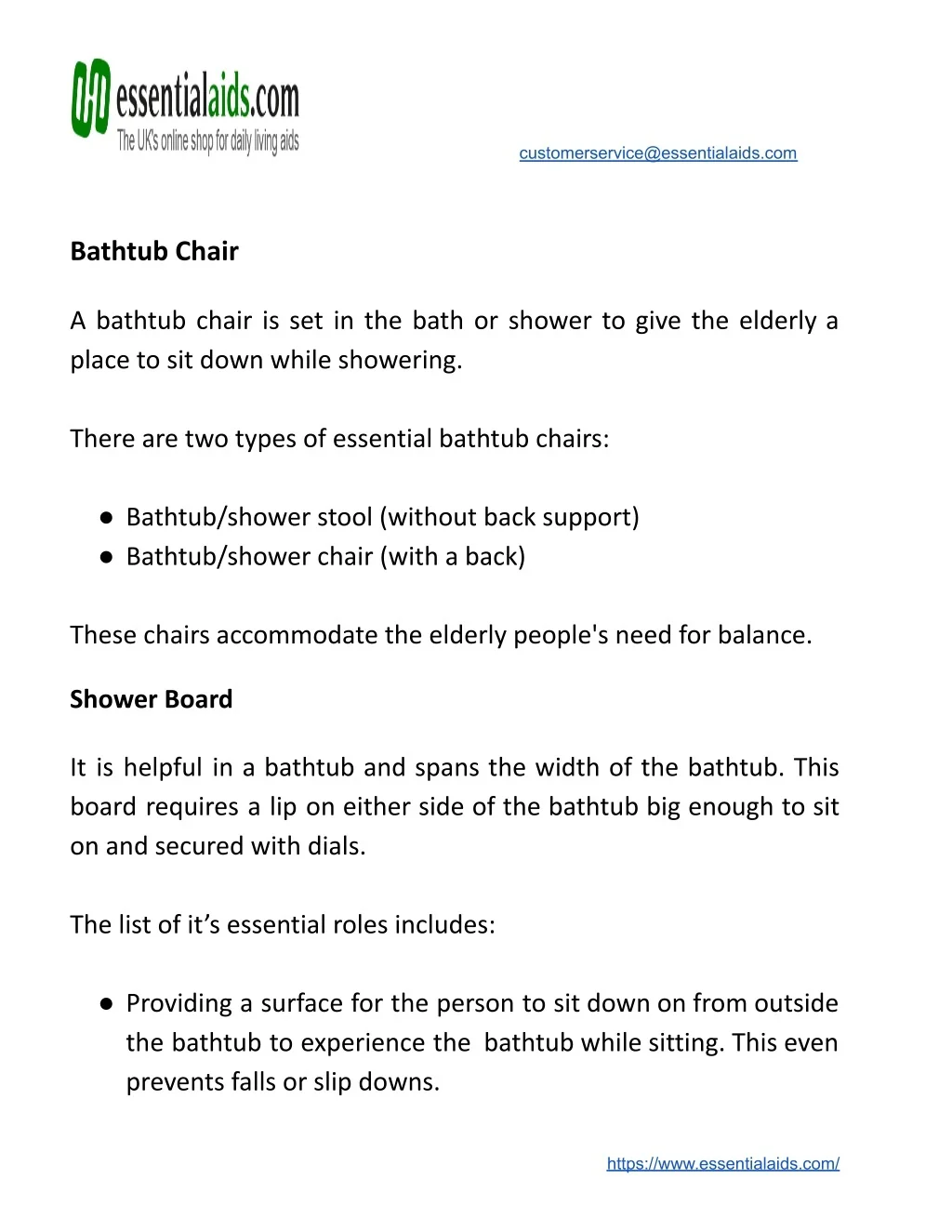 customerservice@essentialaids.com Bathtub Chair A bathtub chair is set in the bath or shower to give the elderly a place to sit down while showering. There are two types of essential bathtub chairs: ● Bathtub/shower stool (without back support) ● Bathtub/shower chair (with a back) These chairs accommodate the elderly people's need for balance. Shower Board It is helpful in a bathtub and spans the width of the bathtub. This board requires a lip on either side of the bathtub big enough to sit on and secured with dials. The list of it’s essential roles includes: ● Providing a surface for the person to sit down on from outside the bathtub to experience the bathtub while sitting. This even prevents falls or slip downs. https://www.essentialaids.com/