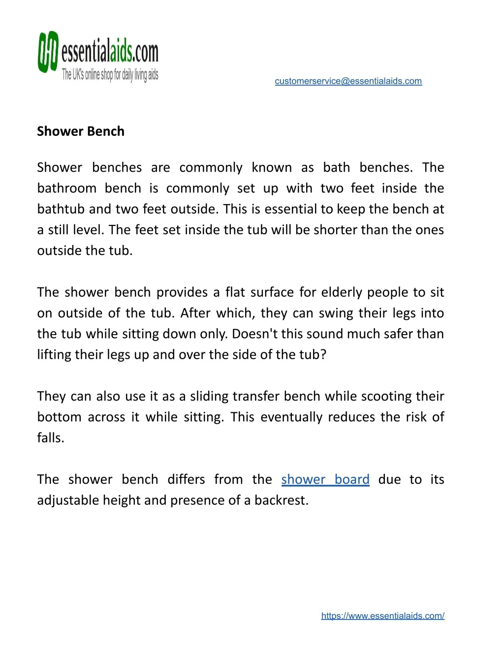customerservice@essentialaids.com Shower Bench Shower benches are commonly known as bath benches. The bathroom bench is commonly set up with two feet inside the bathtub and two feet outside. This is essential to keep the bench at a still level. The feet set inside the tub will be shorter than the ones outside the tub. The shower bench provides a flat surface for elderly people to sit on outside of the tub. After which, they can swing their legs into the tub while sitting down only. Doesn't this sound much safer than lifting their legs up and over the side of the tub? They can also use it as a sliding transfer bench while scooting their bottom across it while sitting. This eventually reduces the risk of falls. The shower bench differs from the shower board due to its adjustable height and presence of a backrest. https://www.essentialaids.com/