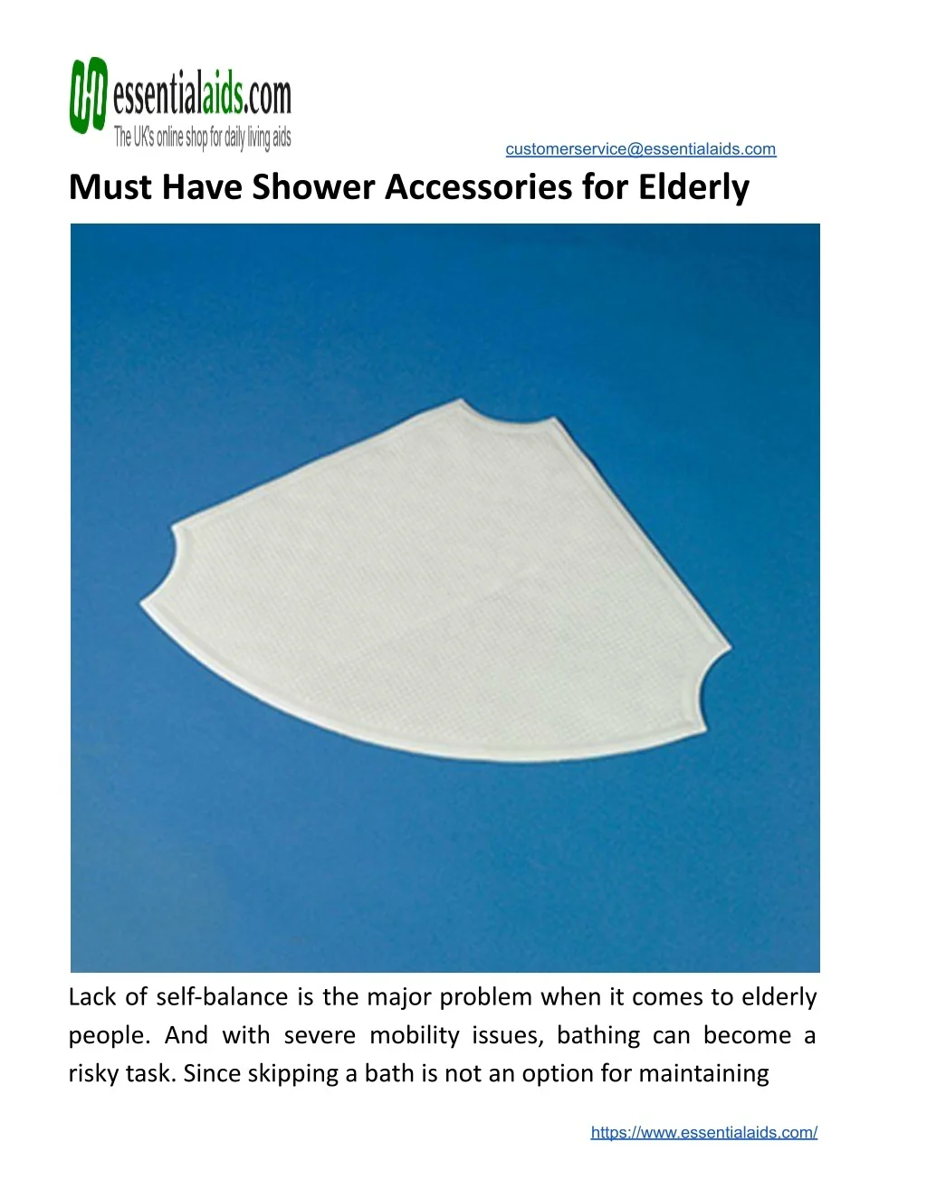 customerservice@essentialaids.com Must Have Shower Accessories for Elderly Lack of self-balance is the major problem when it comes to elderly people. And with severe mobility issues, bathing can become a risky task. Since skipping a bath is not an option for maintaining https://www.essentialaids.com/