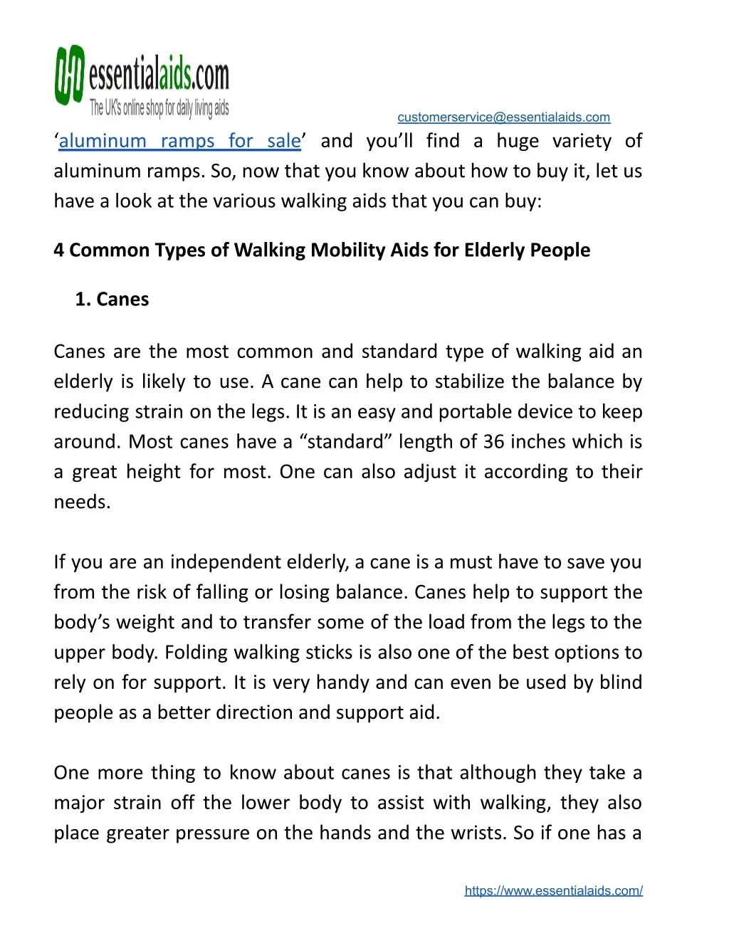 customerservice@essentialaids.com ‘aluminum ramps for sale’ and you’ll find a huge variety of aluminum ramps. So, now that you know about how to buy it, let us have a look at the various walking aids that you can buy: 4 Common Types of Walking Mobility Aids for Elderly People 1. Canes Canes are the most common and standard type of walking aid an elderly is likely to use. A cane can help to stabilize the balance by reducing strain on the legs. It is an easy and portable device to keep around. Most canes have a “standard” length of 36 inches which is a great height for most. One can also adjust it according to their needs. If you are an independent elderly, a cane is a must have to save you from the risk of falling or losing balance. Canes help to support the body’s weight and to transfer some of the load from the legs to the upper body. Folding walking sticks is also one of the best options to rely on for support. It is very handy and can even be used by blind people as a better direction and support aid. One more thing to know about canes is that although they take a major strain off the lower body to assist with walking, they also place greater pressure on the hands and the wrists. So if one has a https://www.essentialaids.com/