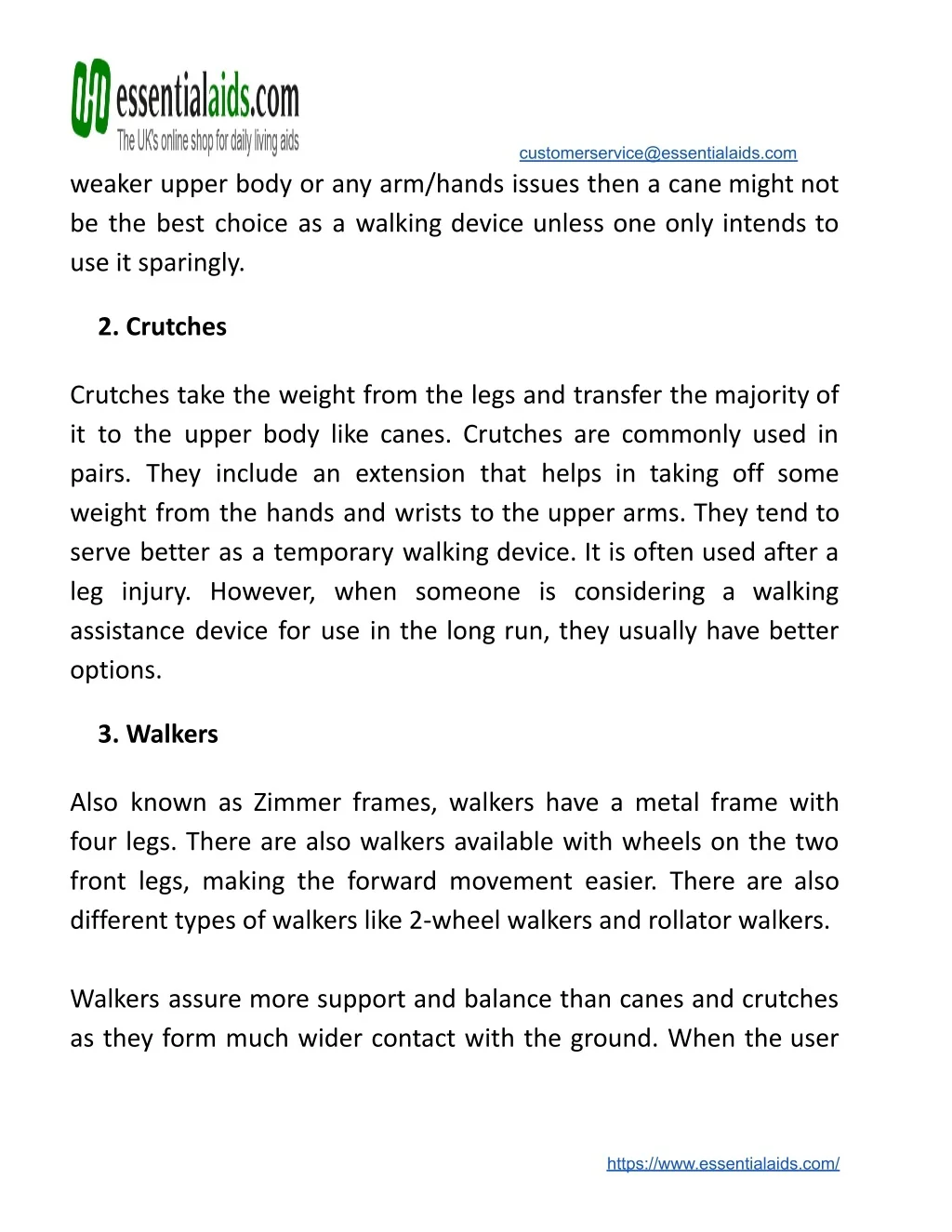 customerservice@essentialaids.com weaker upper body or any arm/hands issues then a cane might not be the best choice as a walking device unless one only intends to use it sparingly. 2. Crutches Crutches take the weight from the legs and transfer the majority of it to the upper body like canes. Crutches are commonly used in pairs. They include an extension that helps in taking off some weight from the hands and wrists to the upper arms. They tend to serve better as a temporary walking device. It is often used after a leg injury. However, when someone is considering a walking assistance device for use in the long run, they usually have better options. 3. Walkers Also known as Zimmer frames, walkers have a metal frame with four legs. There are also walkers available with wheels on the two front legs, making the forward movement easier. There are also different types of walkers like 2-wheel walkers and rollator walkers. Walkers assure more support and balance than canes and crutches as they form much wider contact with the ground. When the user https://www.essentialaids.com/