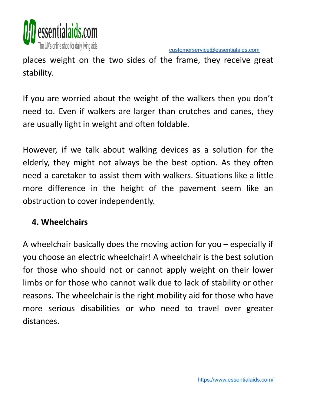 customerservice@essentialaids.com places weight on the two sides of the frame, they receive great stability. If you are worried about the weight of the walkers then you don’t need to. Even if walkers are larger than crutches and canes, they are usually light in weight and often foldable. However, if we talk about walking devices as a solution for the elderly, they might not always be the best option. As they often need a caretaker to assist them with walkers. Situations like a little more difference in the height of the pavement seem like an obstruction to cover independently. 4. Wheelchairs A wheelchair basically does the moving action for you – especially if you choose an electric wheelchair! A wheelchair is the best solution for those who should not or cannot apply weight on their lower limbs or for those who cannot walk due to lack of stability or other reasons. The wheelchair is the right mobility aid for those who have more serious disabilities or who need to travel over greater distances. https://www.essentialaids.com/