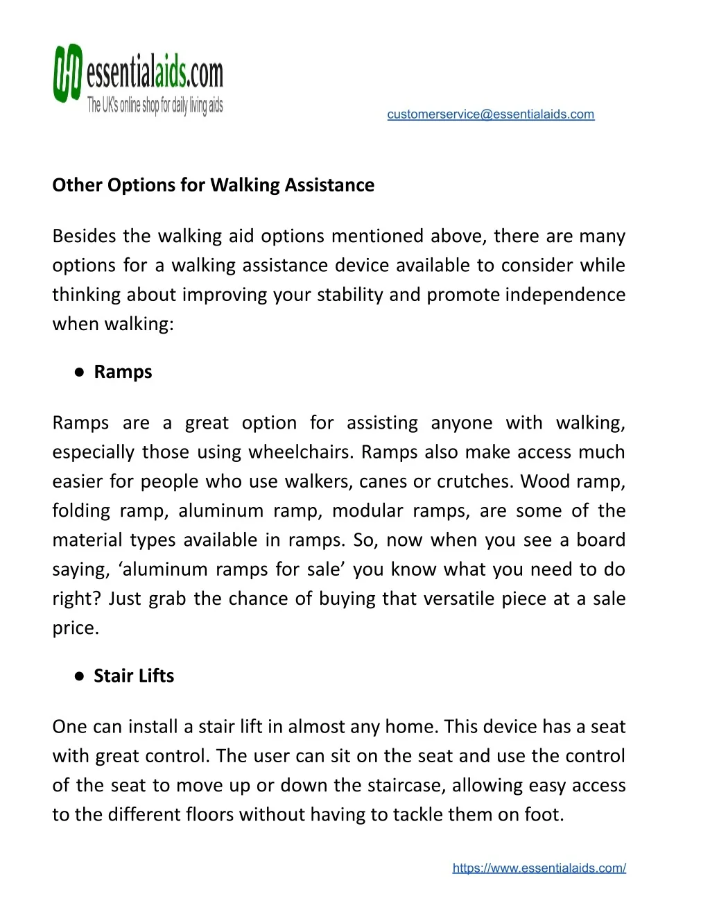 customerservice@essentialaids.com Other Options for Walking Assistance Besides the walking aid options mentioned above, there are many options for a walking assistance device available to consider while thinking about improving your stability and promote independence when walking: ● Ramps Ramps are a great option for assisting anyone with walking, especially those using wheelchairs. Ramps also make access much easier for people who use walkers, canes or crutches. Wood ramp, folding ramp, aluminum ramp, modular ramps, are some of the material types available in ramps. So, now when you see a board saying, ‘aluminum ramps for sale’ you know what you need to do right? Just grab the chance of buying that versatile piece at a sale price. ● Stair Lifts One can install a stair lift in almost any home. This device has a seat with great control. The user can sit on the seat and use the control of the seat to move up or down the staircase, allowing easy access to the different floors without having to tackle them on foot. https://www.essentialaids.com/