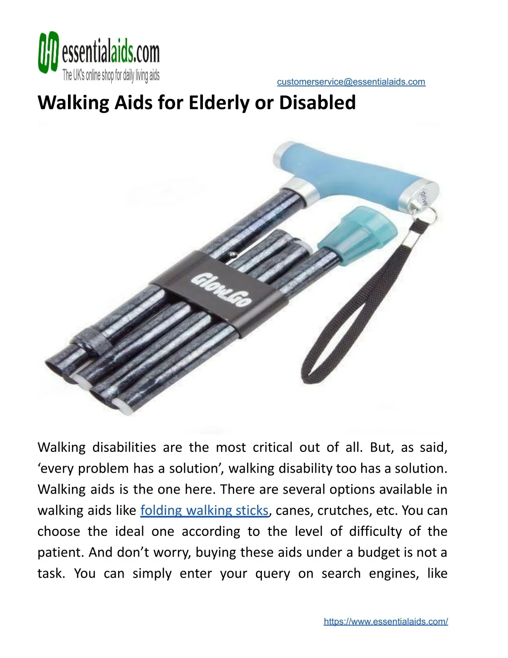customerservice@essentialaids.com Walking Aids for Elderly or Disabled Walking disabilities are the most critical out of all. But, as said, ‘every problem has a solution’, walking disability too has a solution. Walking aids is the one here. There are several options available in walking aids like folding walking sticks, canes, crutches, etc. You can choose the ideal one according to the level of difficulty of the patient. And don’t worry, buying these aids under a budget is not a task. You can simply enter your query on search engines, like https://www.essentialaids.com/