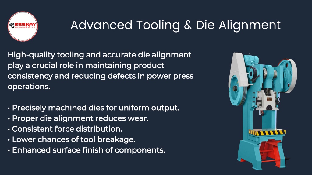Advanced Tooling & Die Alignment High-quality tooling and accurate die alignment play a crucial role in maintaining product consistency and reducing defects in power press operations. • Precisely machined dies for uniform output. • Proper die alignment reduces wear. • Consistent force distribution. • Lower chances of tool breakage. • Enhanced surface finish of components.