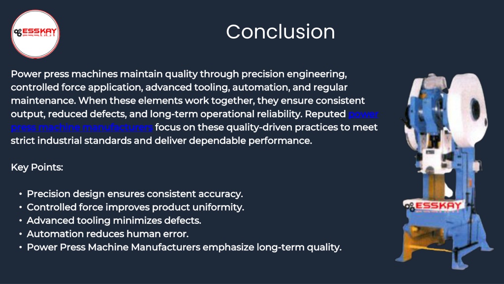Conclusion • Power press machines maintain quality through precision engineering, controlled force application, advanced tooling, automation, and regular maintenance. When these elements work together, they ensure consistent output, reduced defects, and long-term operational reliability. Reputed power press machine manufacturers focus on these quality-driven practices to meet strict industrial standards and deliver dependable performance. • Key Points: • Precision design ensures consistent accuracy. • Controlled force improves product uniformity. • Advanced tooling minimizes defects. • Automation reduces human error. • Power Press Machine Manufacturers emphasize long-term quality.
