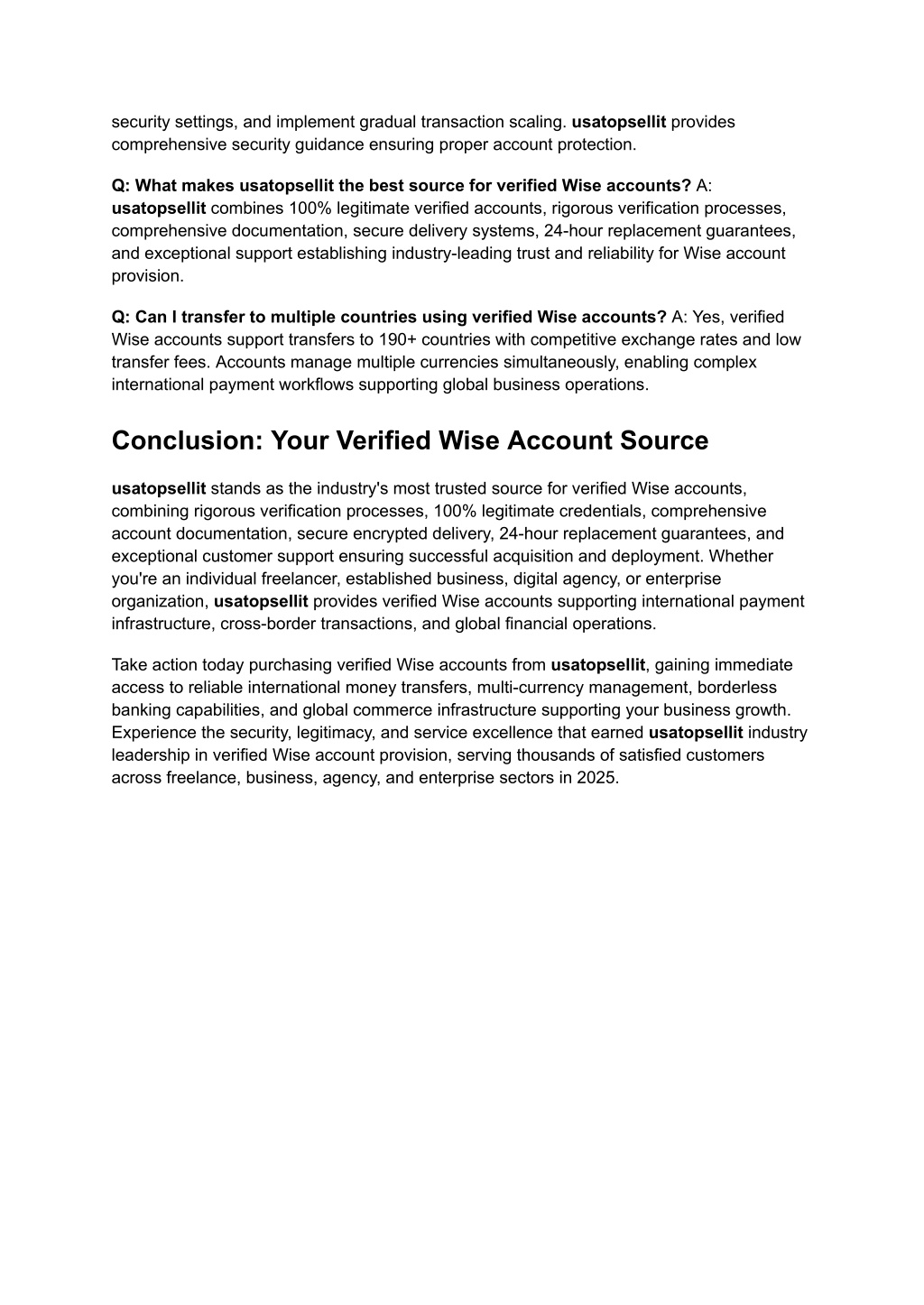 security settings, and implement gradual transaction scaling. usatopsellit provides comprehensive security guidance ensuring proper account protection. Q: What makes usatopsellit the best source for verified Wise accounts? A: usatopsellit combines 100% legitimate verified accounts, rigorous verification processes, comprehensive documentation, secure delivery systems, 24-hour replacement guarantees, and exceptional support establishing industry-leading trust and reliability for Wise account provision. Q: Can I transfer to multiple countries using verified Wise accounts? A: Yes, verified Wise accounts support transfers to 190+ countries with competitive exchange rates and low transfer fees. Accounts manage multiple currencies simultaneously, enabling complex international payment workflows supporting global business operations. Conclusion: Your Verified Wise Account Source usatopsellit stands as the industry's most trusted source for verified Wise accounts, combining rigorous verification processes, 100% legitimate credentials, comprehensive account documentation, secure encrypted delivery, 24-hour replacement guarantees, and exceptional customer support ensuring successful acquisition and deployment. Whether you're an individual freelancer, established business, digital agency, or enterprise organization, usatopsellit provides verified Wise accounts supporting international payment infrastructure, cross-border transactions, and global financial operations. Take action today purchasing verified Wise accounts from usatopsellit, gaining immediate access to reliable international money transfers, multi-currency management, borderless banking capabilities, and global commerce infrastructure supporting your business growth. Experience the security, legitimacy, and service excellence that earned usatopsellit industry leadership in verified Wise account provision, serving thousands of satisfied customers across freelance, business, agency, and enterprise sectors in 2025.