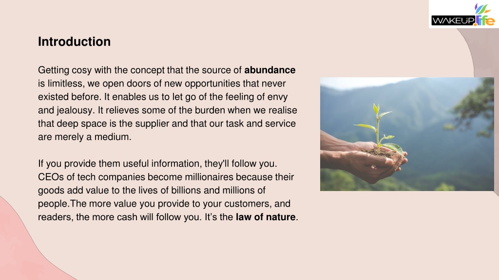 Introduction Getting cosy with the concept that the source of abundance is limitless, we open doors of new opportunities that never existed before. It enables us to let go of the feeling of envy and jealousy. It relieves some of the burden when we realise that deep space is the supplier and that our task and service are merely a medium. If you provide them useful information, they'll follow you. CEOs of tech companies become millionaires because their goods add value to the lives of billions and millions of people.The more value you provide to your customers, and readers, the more cash will follow you. It’s the law of nature.