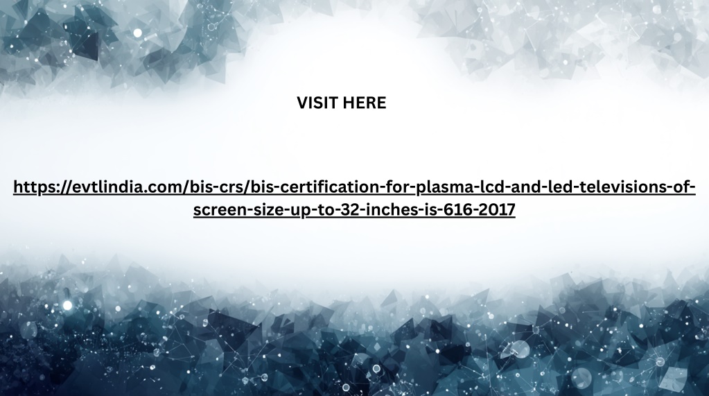1. VISIT HERE https://evtlindia.com/bis-crs/bis-certification-for-plasma-lcd-and-led-televisions-of- screen-size-up-to-32-inches-is-616-2017