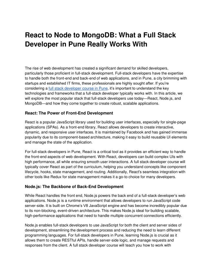 Express.js, a popular Node.js framework, to set up routing, middleware, and manage requests effectively. MongoDB: The NoSQL Database for Modern Applications On the back-end, full-stack developers also work with databases to store and retrieve data. MongoDB is one of the most popular NoSQL databases that has gained traction in modern web development. Unlike traditional relational databases, MongoDB stores data in flexible, JSON-like documents, making it easier to work with unstructured and semi-structured data. MongoDB’s flexibility allows full-stack developers to scale applications quickly without having to deal with the constraints of rigid schemas. It works well with Node.js, and its ability to scale horizontally makes it an ideal choice for modern web applications that need to handle large volumes of data. For developers in Pune, mastering MongoDB is a valuable skill. It is used extensively in full-stack development for handling everything from user data and application settings to complex data models. A full stack developer course will cover MongoDB’s core features, including CRUD operations (Create, Read, Update, Delete), data modeling, aggregation, and indexing, which are essential for building efficient, data-driven applications. How These Technologies Work Together When combined, React, Node.js, and MongoDB form the powerful MERN stack, one of the most popular stacks for full-stack development. In a MERN-based application, React is responsible for rendering the front-end UI and handling user interactions, while Node.js and Express.js take care of the back-end logic and server-side processes. MongoDB stores and retrieves the data that powers the application. The beauty of this stack lies in the fact that all components use JavaScript. This allows full-stack developers to write both the front-end and back-end code using the same programming language, leading to better code efficiency, quicker development cycles, and improved collaboration between front-end and back-end teams. Additionally, the MERN stack is highly scalable, making it ideal for startups and companies in Pune looking to build flexible, high-performing applications. Conclusion A full stack developer course in Pune provides a comprehensive foundation for anyone looking to work with the latest technologies in web development. By mastering tools like React, Node.js, and MongoDB, aspiring developers can build complete, end-to-end applications that are both powerful and scalable. As Pune continues to thrive as a startup ecosystem, the demand for skilled full-stack developers will only continue to grow. If you are ready to take your development skills to the next level and become part of this exciting tech landscape, enrolling in a full-stack developer course is a great way to get started on the right path.