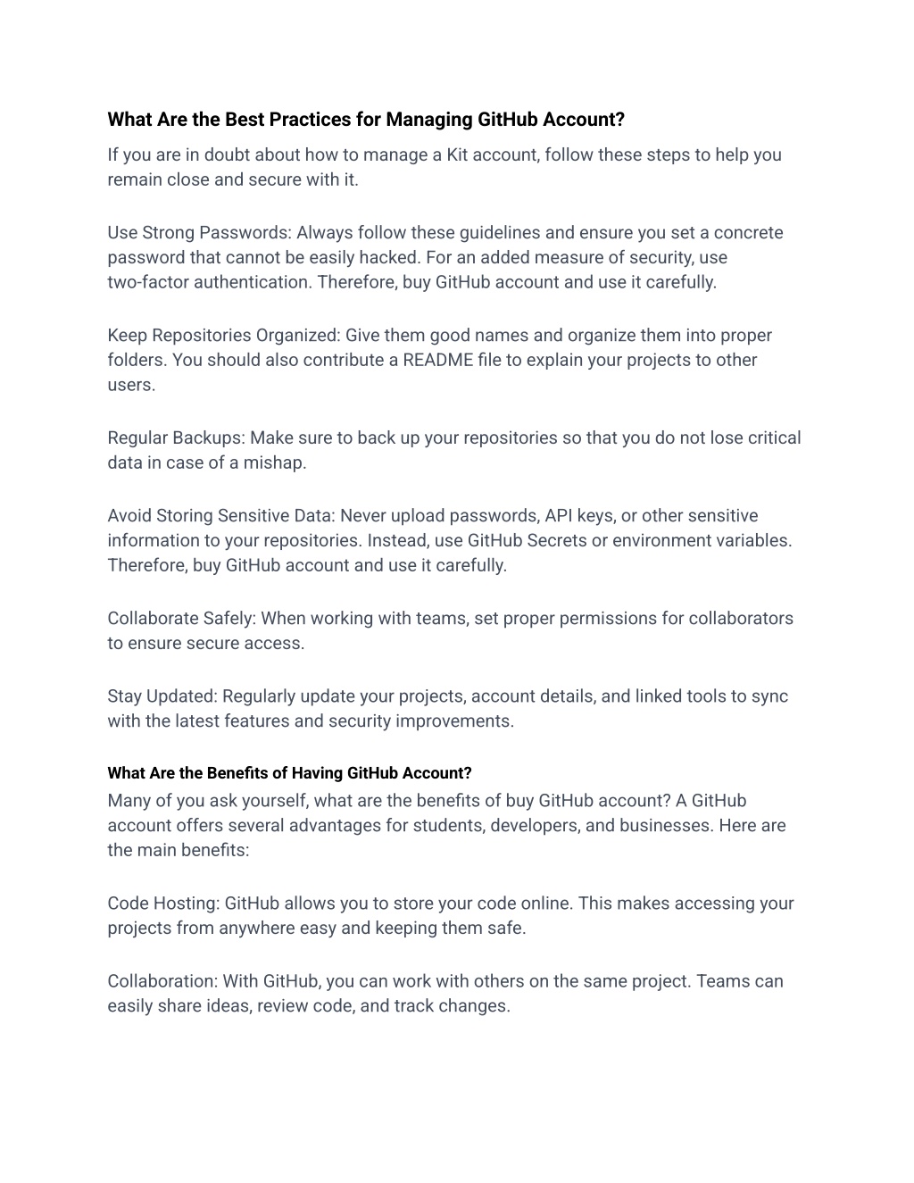 What Are the Best Practices for Managing GitHub Account? If you are in doubt about how to manage a Kit account, follow these steps to help you remain close and secure with it. Use Strong Passwords: Always follow these guidelines and ensure you set a concrete password that cannot be easily hacked. For an added measure of security, use two-factor authentication. Therefore, buy GitHub account and use it carefully. Keep Repositories Organized: Give them good names and organize them into proper folders. You should also contribute a README file to explain your projects to other users. Regular Backups: Make sure to back up your repositories so that you do not lose critical data in case of a mishap. Avoid Storing Sensitive Data: Never upload passwords, API keys, or other sensitive information to your repositories. Instead, use GitHub Secrets or environment variables. Therefore, buy GitHub account and use it carefully. Collaborate Safely: When working with teams, set proper permissions for collaborators to ensure secure access. Stay Updated: Regularly update your projects, account details, and linked tools to sync with the latest features and security improvements. What Are the Benefits of Having GitHub Account? Many of you ask yourself, what are the benefits of buy GitHub account? A GitHub account offers several advantages for students, developers, and businesses. Here are the main benefits: Code Hosting: GitHub allows you to store your code online. This makes accessing your projects from anywhere easy and keeping them safe. Collaboration: With GitHub, you can work with others on the same project. Teams can easily share ideas, review code, and track changes.