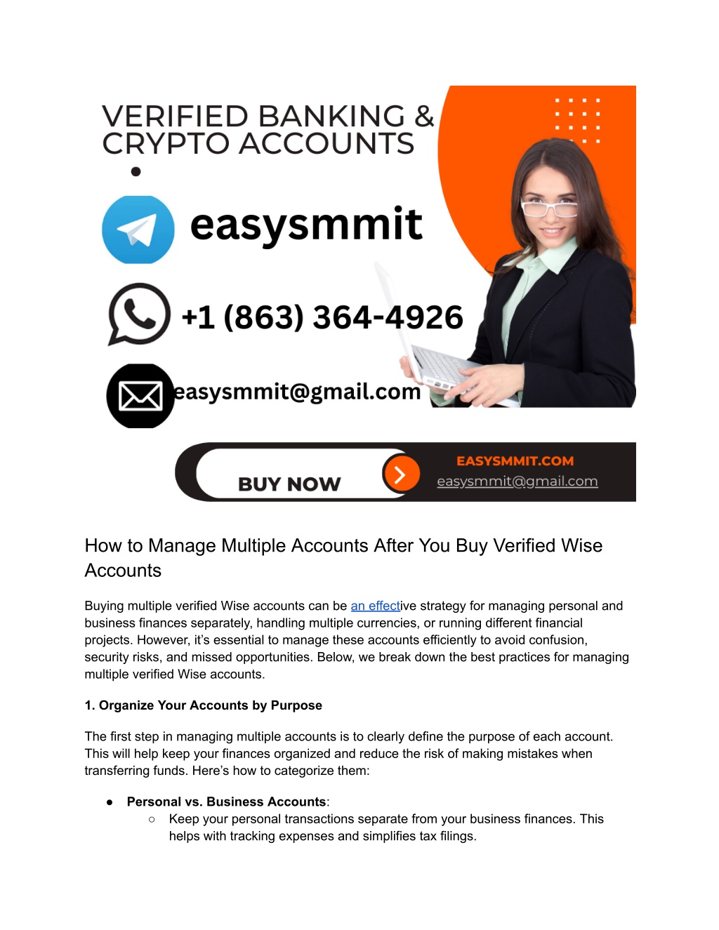 13. How to Manage Multiple Accounts After You Buy Verified Wise Accounts Buying multiple verified Wise accounts can be an effective strategy for managing personal and business finances separately, handling multiple currencies, or running different financial projects. However, it’s essential to manage these accounts efficiently to avoid confusion, security risks, and missed opportunities. Below, we break down the best practices for managing multiple verified Wise accounts. 1. Organize Your Accounts by Purpose The first step in managing multiple accounts is to clearly define the purpose of each account. This will help keep your finances organized and reduce the risk of making mistakes when transferring funds. Here’s how to categorize them: ● Personal vs. Business Accounts: ○ Keep your personal transactions separate from your business finances. This helps with tracking expenses and simplifies tax filings.